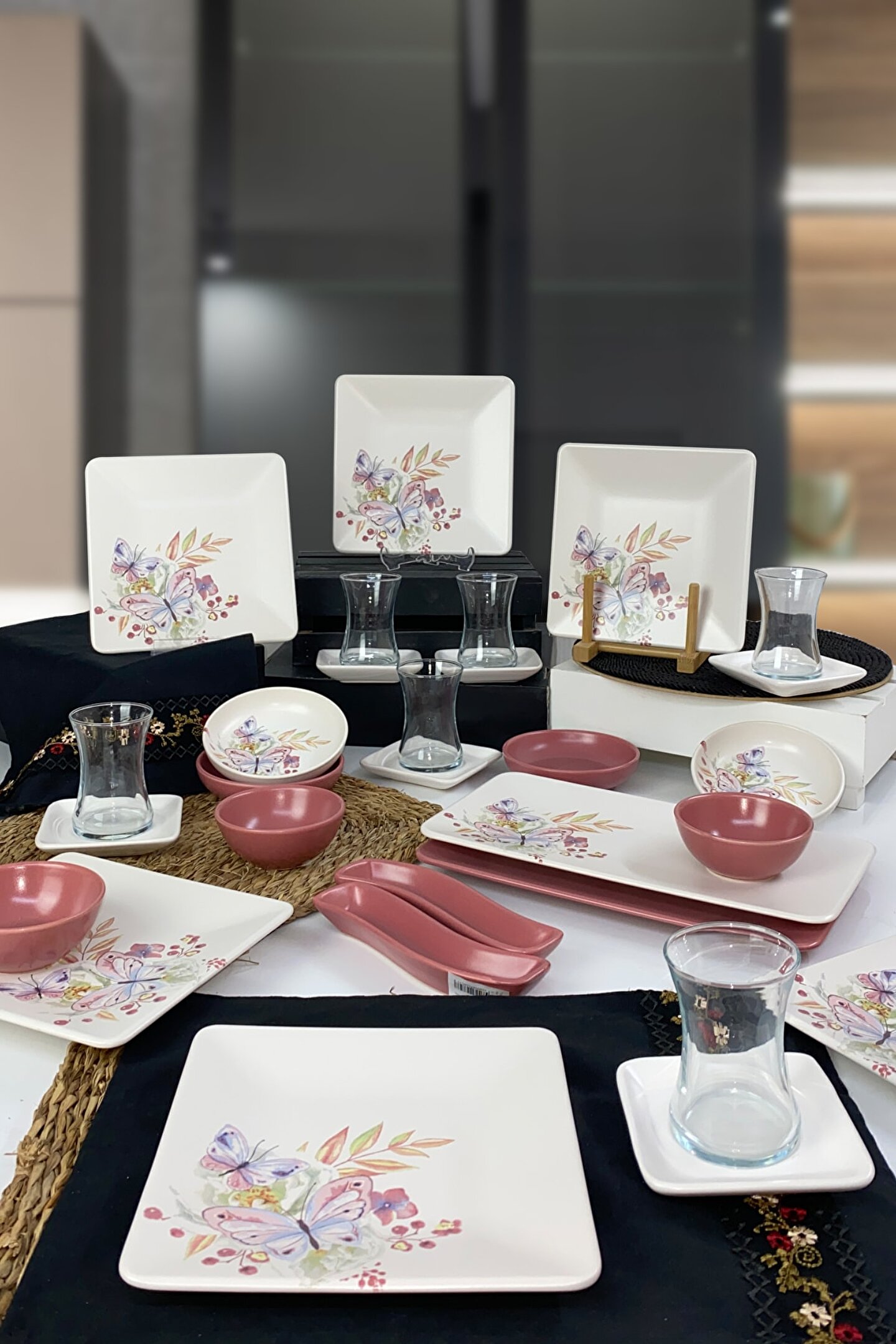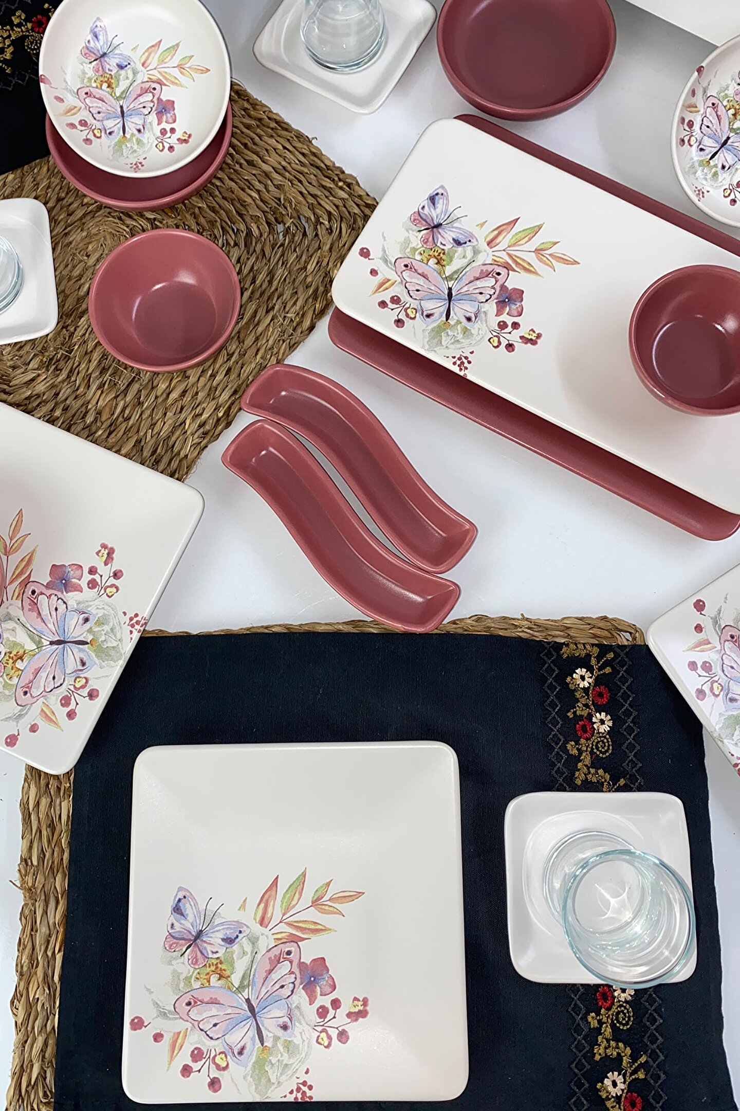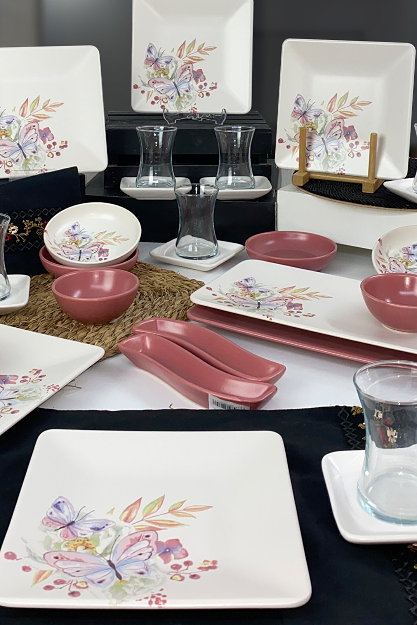 6 Adet desenli 20cm Kare Kahvaltı Tabağı ; 6 adet mat beyaz çay tabağı ; 6 adet cam çay bardağı ; 3 Adet gül kurusu 10cm Yuvarlak Kahvaltılık ; 2 adet gül kurusu 13cm yuvarlak kahvaltılık ; 2 adet desenli 13cm yuvarlak kahvaltılık ; 2 Adet gül kurusu Ivory Zeytinlik ; 1 Adet Desenli 33x17cm Dikdörtgen Kayık Tabak ; 1 Adet gül kurusu 31x21cm Dikdörtgen Kayık Tabak ; Ürün kullanımı: Renkleri ve baskısı solmaz.; Kolay temizlenir, mikrop barındırmaz.; Bulaşık makinesinde 50°C'de yıkanabilir.; Tamamen sağlıklı ve ekolojik malzeme yapısına sahiptir.; Türkiye’de üretilmiştir.; ; Almış olduğunuz bu üründe kırık ürün değişim garantisi bulunmaktadır.; Koli içerisinde bilgilendirme broşürü yer almaktadır.; ;