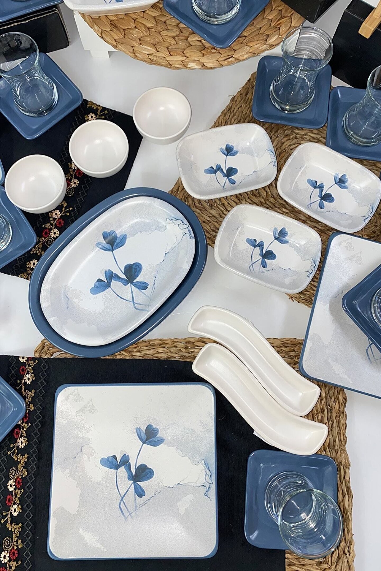 12 adet desenli 20 cm kahvaltı tabağı ; 12 adet cam çay bardağı ; 12 adet mat mavi çay tabağı ; 4 adet desenli 13cm dikdörtgen ; 3 adet mat beyaz 8cm kase ; 2 adet mat beyaz zeytinlik ; 1 adet desenli 22cm kayık ; 1 adet mat mavi 25cm kayık ; Ürün kullanımı: Renkleri ve baskısı solmaz.; Kolay temizlenir, mikrop barındırmaz.; ; Bulaşık makinesi normal ayarında yıkanabilir.; ; Tamamen sağlıklı ve ekolojik malzeme yapısına sahiptir.; ; Türkiye’de üretilmiştir.; ; Almış olduğunuz bu üründe kırık ürün değişim garantisi bulunmaktadır.; Koli içerisinde bilgilendirme broşürü yer almaktadır.; ; Taşıma esnasında kırılma riskine karşı güvenli paketleme yapılarak gönderimi sağlanmaktadır.; ; Koli ölçüleri : 36x36x34cm ; Koli Ağırlık: 12KG ;