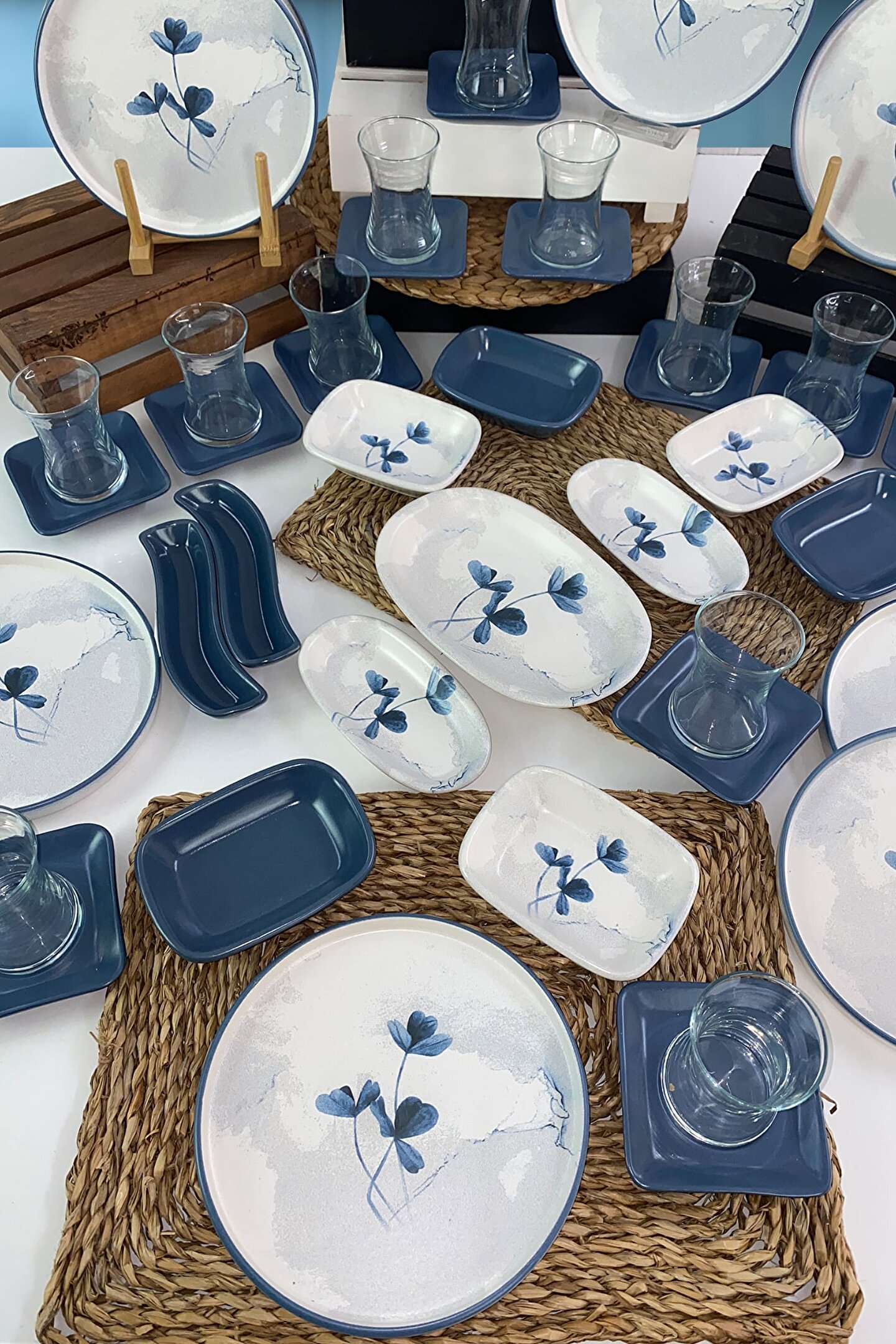 12 adet 21cm desenli pasta tabağı ; 12 adet mat mavi çay tabağı ; 12 adet cam çay bardağı ; 3 adet 13cm desenli dikdörtgen kahvaltılık ; 3 adet 13cm mat mavi dikdörtgen kahvaltılık ; 2 adet 16cm desenli kayık ; 1 adet 22cm desenli kayık ; 2 adet mat mavi zeytinlik ; Ürün kullanımı: Renkleri ve baskısı solmaz. Kolay temizlenir, mikrop barındırmaz. ; Bulaşık makinesi normal ayarında yıkanabilir. ; Tamamen sağlıklı ve ekolojik malzeme yapısına sahiptir. ; Türkiye’de üretilmiştir. ; Almış olduğunuz bu üründe kırık ürün değişim garantisi bulunmaktadır. Koli içerisinde bilgilendirme broşürü yer almaktadır. ; Taşıma esnasında kırılma riskine karşı güvenli paketleme yapılarak gönderimi sağlanmaktadır ;