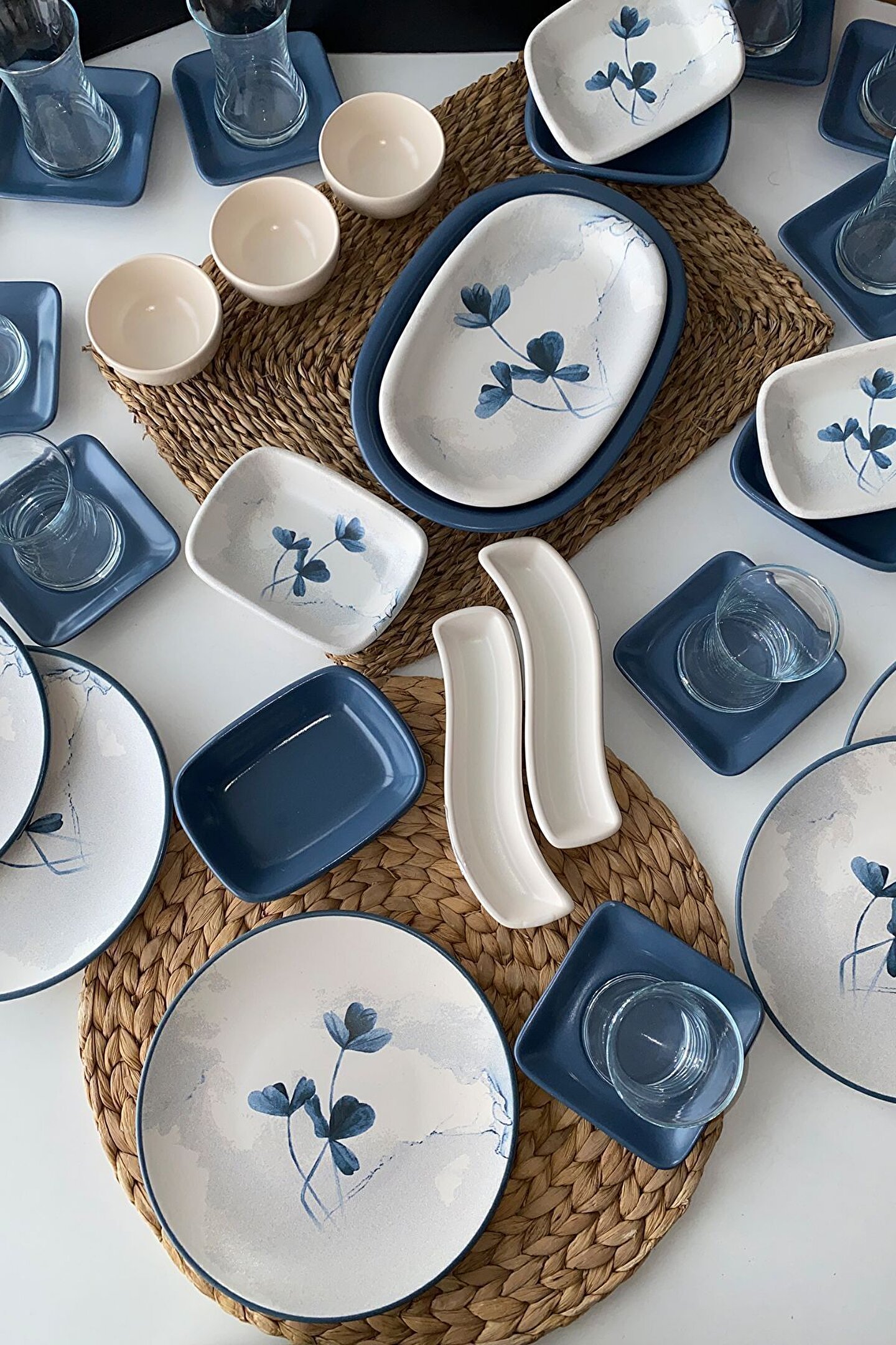 12 adet 20cm desenli kahvaltı tabağı ; 12 adet mat mavi çay tabağı ; 12 adet cam çay bardağı ; 3 adet 13cm desenli dikdörtgen kahvaltılık ; 3 adet 13cm mat mavi dikdörtgen kahvaltılık ; 3 adet 8cm mat beyaz kase ; 2 adet mat beyaz zeytinlik ; 1 adet 25cm mat mavi kayık ; 1 adet 22cm desenli kayık ; Ürün kullanımı: Renkleri ve baskısı solmaz. Kolay temizlenir, mikrop barındırmaz. ; Bulaşık makinesi normal ayarında yıkanabilir. ; Tamamen sağlıklı ve ekolojik malzeme yapısına sahiptir. ; Türkiye’de üretilmiştir. ; Almış olduğunuz bu üründe kırık ürün değişim garantisi bulunmaktadır. Koli içerisinde bilgilendirme broşürü yer almaktadır. ; Taşıma esnasında kırılma riskine karşı güvenli paketleme yapılarak gönderimi sağlanmaktadır. ;