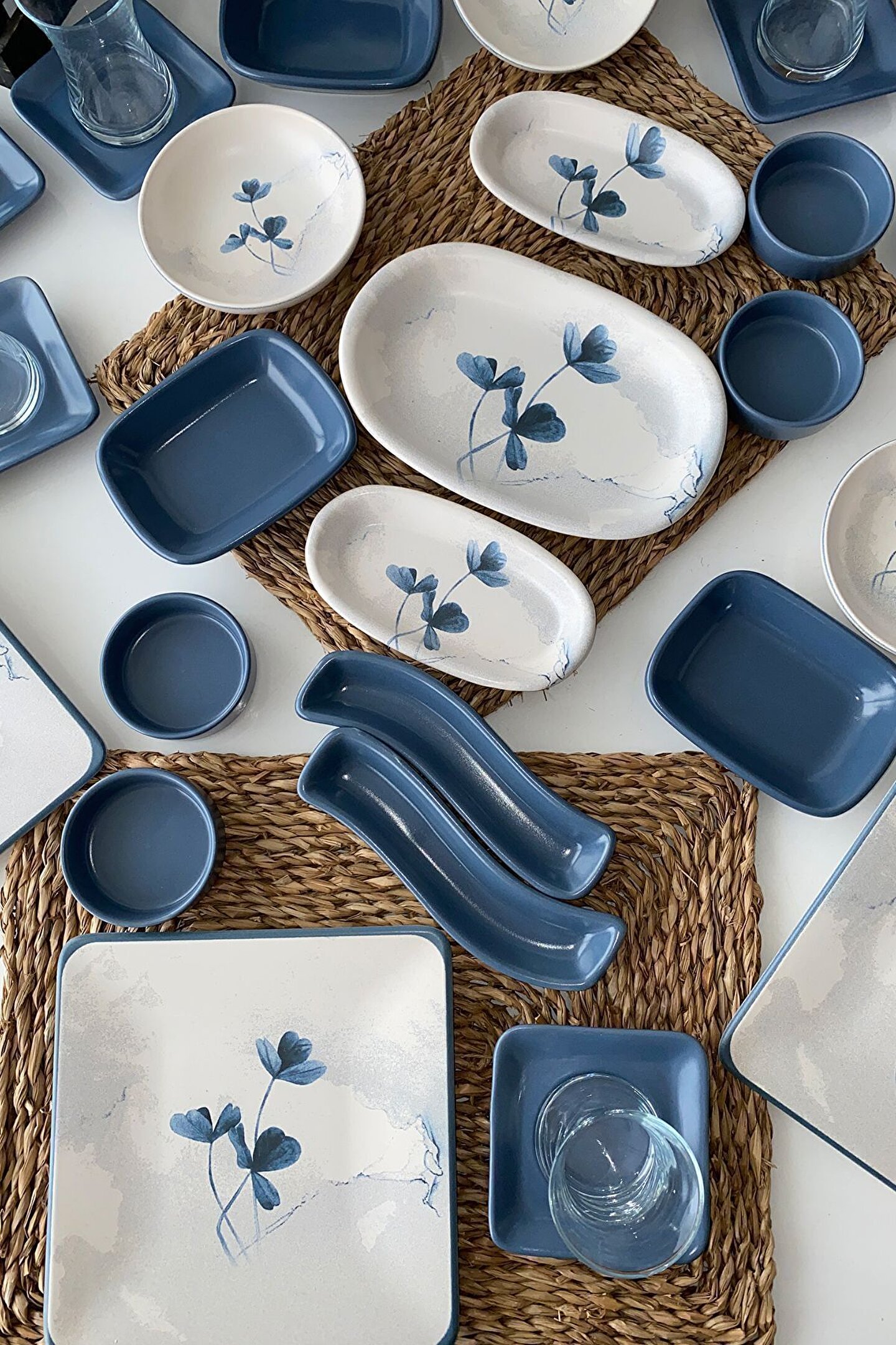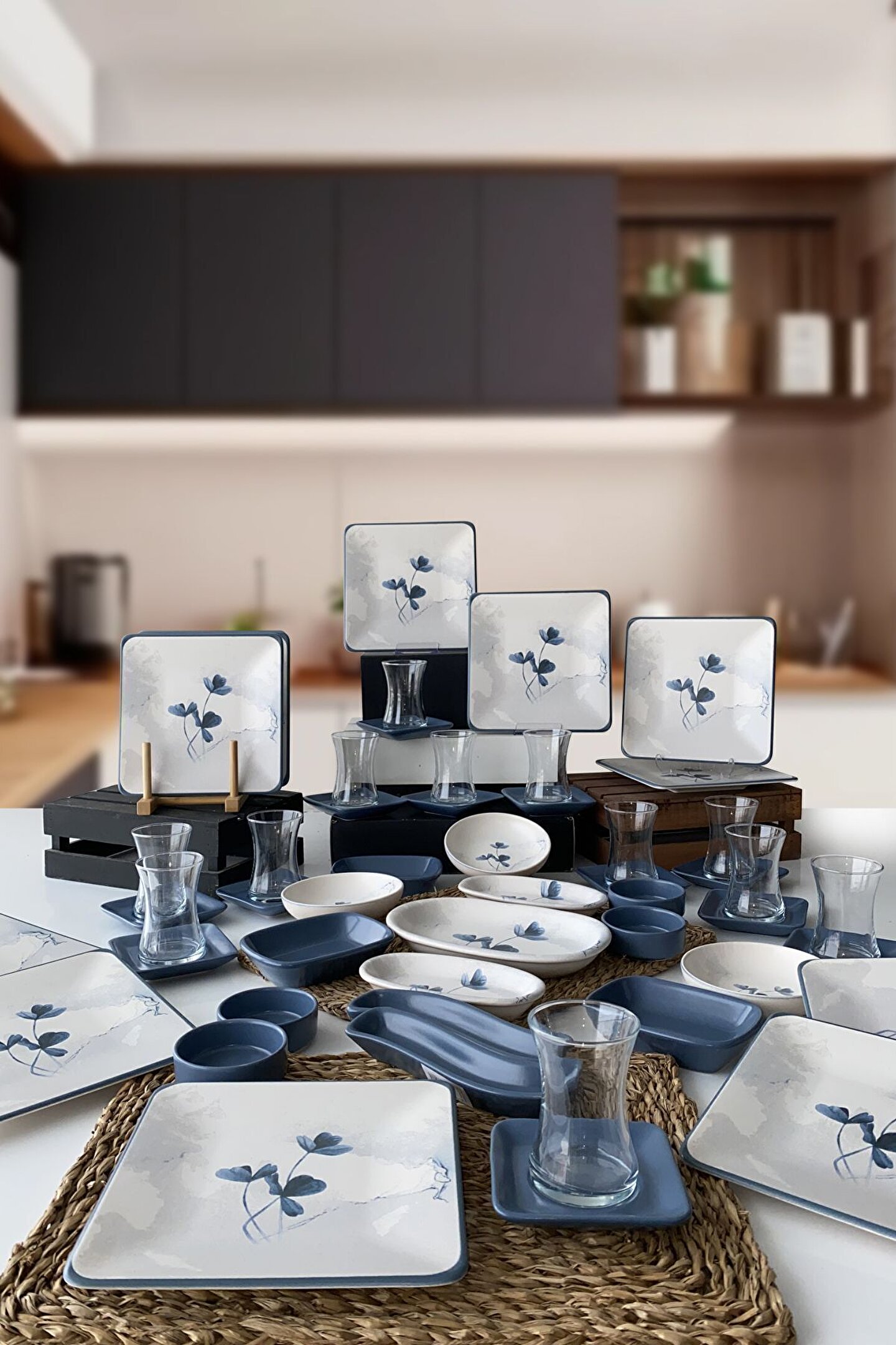12 adet desenli 20 cm kahvaltı tabağı ; 12 adet cam çay bardağı ; 12 adet mat mavi çay tabağı ; 4 adet mat mavi 8cm kase ; 3 adet desenli 13cm yuvarlak kase; 3 adet desenli 13cm dikdörtgen ; 2 adet mat mavi zeytinlik ; 2 adet desenli 16cm kayık ; 1 adet desenli 22cm kayık; Ürün kullanımı: Renkleri ve baskısı solmaz. Kolay temizlenir, mikrop barındırmaz. ; Bulaşık makinesi normal ayarında yıkanabilir. ; Tamamen sağlıklı ve ekolojik malzeme yapısına sahiptir. ; Türkiye’de üretilmiştir. ; Almış olduğunuz bu üründe kırık ürün değişim garantisi bulunmaktadır. Koli içerisinde bilgilendirme broşürü yer almaktadır. ; Taşıma esnasında kırılma riskine karşı güvenli paketleme yapılarak gönderimi sağlanmaktadır. ;