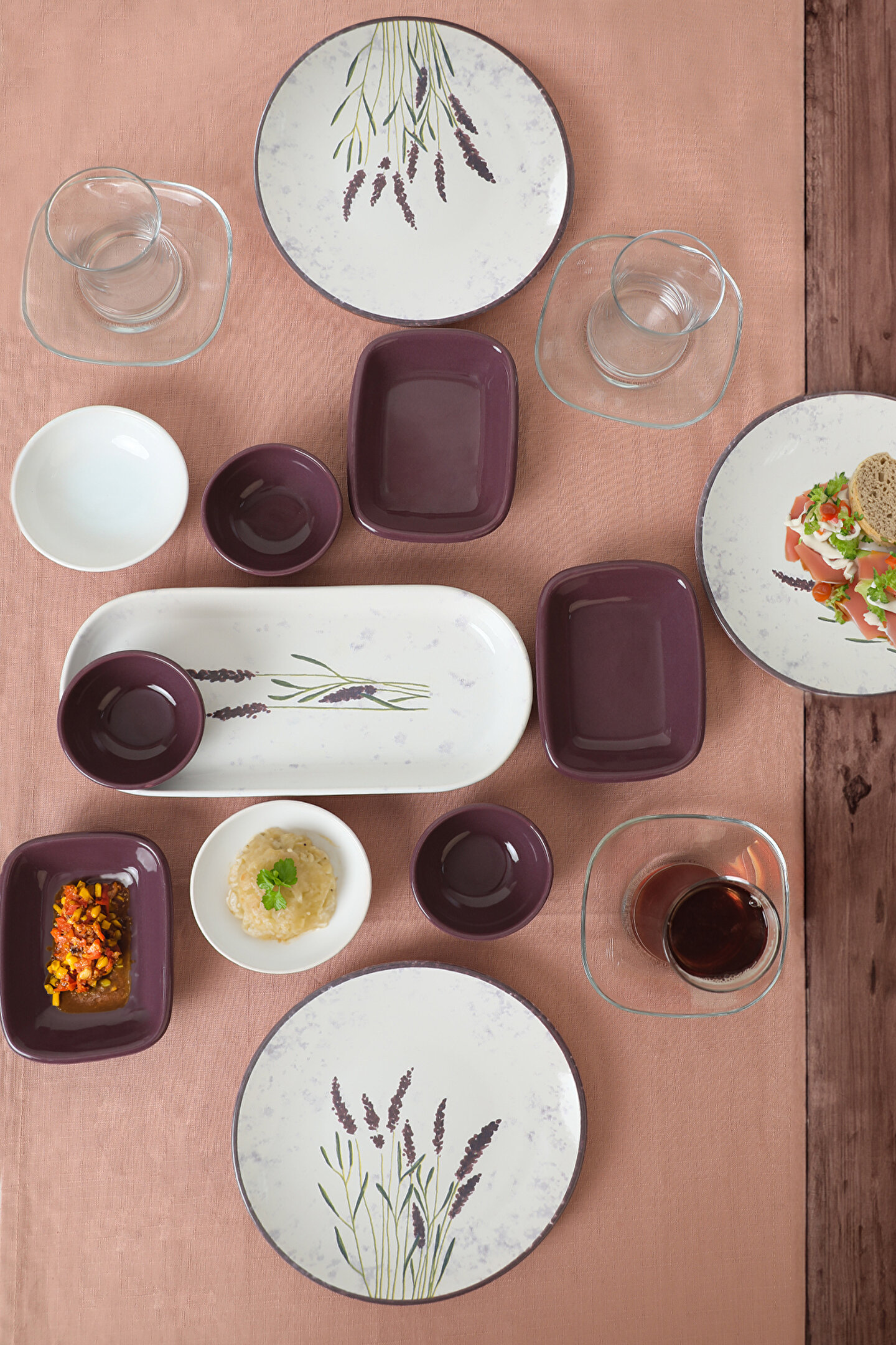 4 adet 20cm desenli tabak ; 4 adet cam çay bardağı ; 4 adet cam çay tabağı; 2 adet 10cm beyaz kase ; 3 adet 13cm mor dikdörtgen ; 3 adet 8cm mor kase ; 1 adet 26cm kayık ; Ürün kullanımı: Renkleri ve baskısı solmaz. ; Kolay temizlenir, mikrop barındırmaz. ; Bulaşık makinesi normal ayarında yıkanabilir. ; Tamamen sağlıklı ve ekolojik malzeme yapısına sahiptir. ; Türkiye’de üretilmiştir. ; Almış olduğunuz bu üründe kırık ürün değişim garantisi bulunmaktadır. Koli içerisinde bilgilendirme broşürü yer almaktadır. ; Taşıma esnasında kırılma riskine karşı güvenli paketleme yapılarak gönderimi sağlanmaktadır. ;