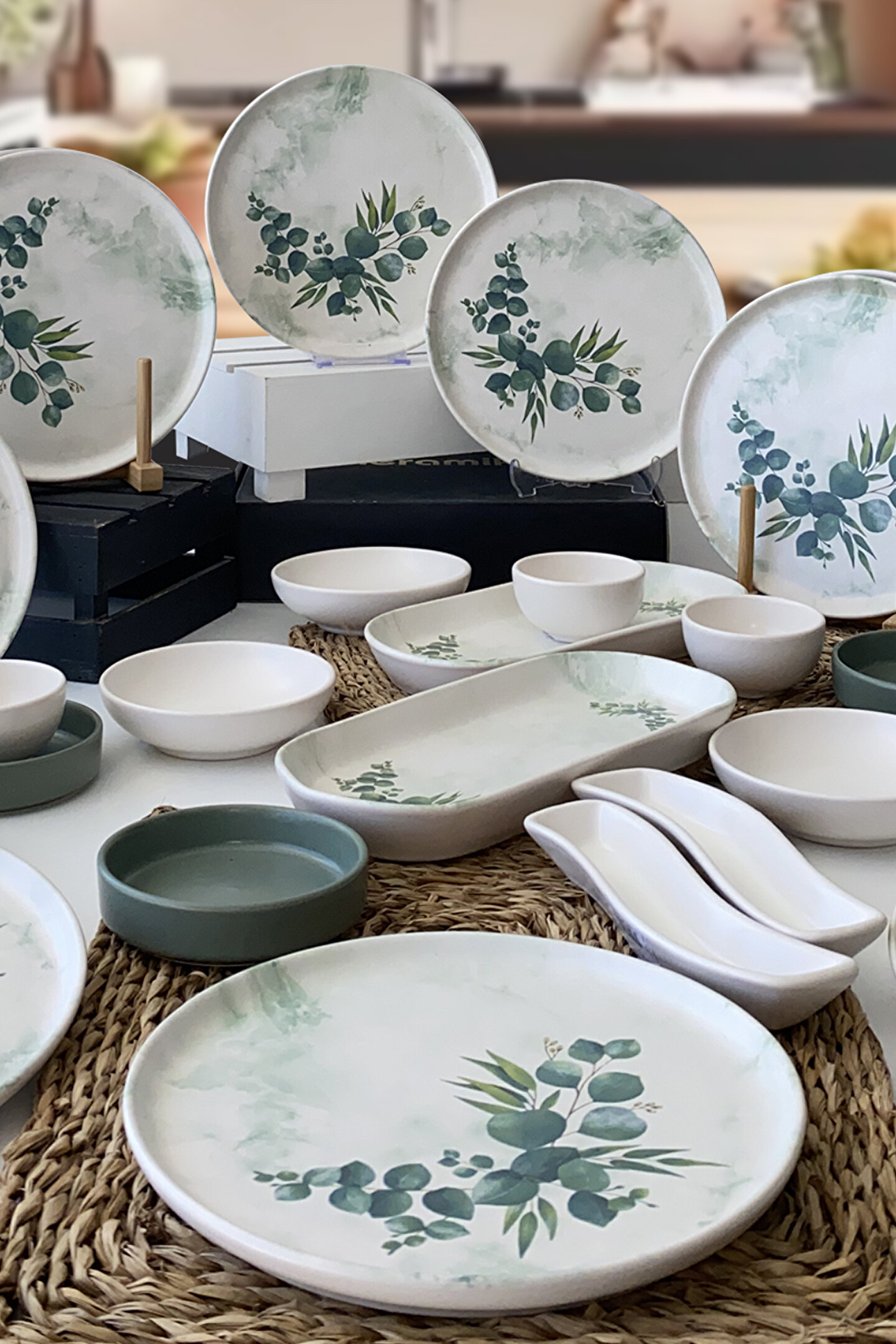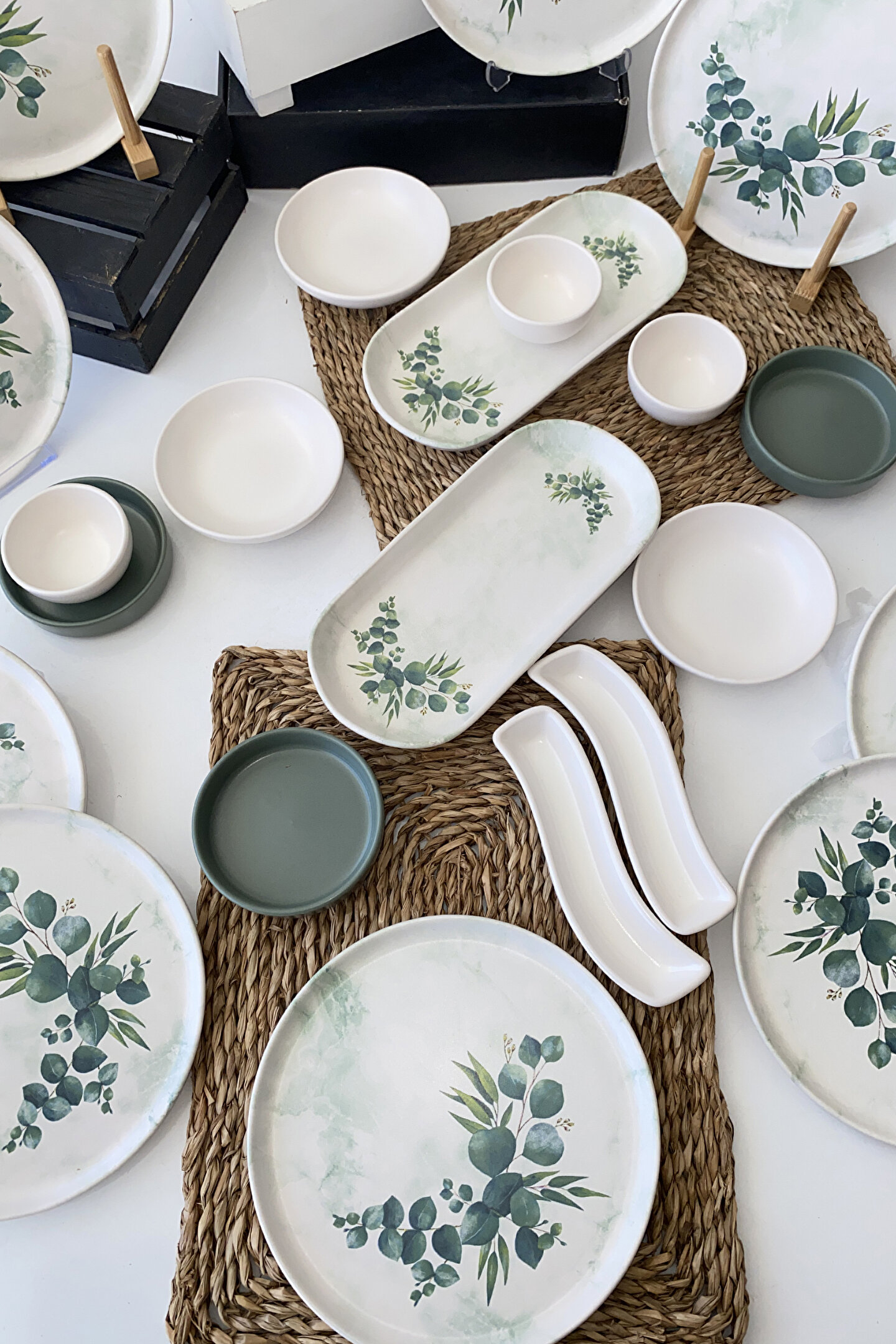 12 adet 22cm mat desenli tabak ; 3 adet 13cm mat beyaz kase ; 3 adet 11cm mat yeşil kase ; 3 adet 8cm mat beyaz kase ; 2 adet 26cm mat desenli kayık ; 2 adet mat beyaz zeytinlik; Yüzey Yapısı : Mat renkli ; Ürün kullanımı: Renkleri ve baskısı solmaz. ; Kolay temizlenir, mikrop barındırmaz. ; Bulaşık makinesi normal ayarında yıkanabilir. ; Tamamen sağlıklı ve ekolojik malzeme yapısına sahiptir. ; Türkiye’de üretilmiştir. ; Almış olduğunuz bu üründe kırık ürün değişim garantisi bulunmaktadır. Koli içerisinde bilgilendirme broşürü yer almaktadır. ; Taşıma esnasında kırılma riskine karşı güvenli paketleme yapılarak gönderimi sağlanmaktadır. ;