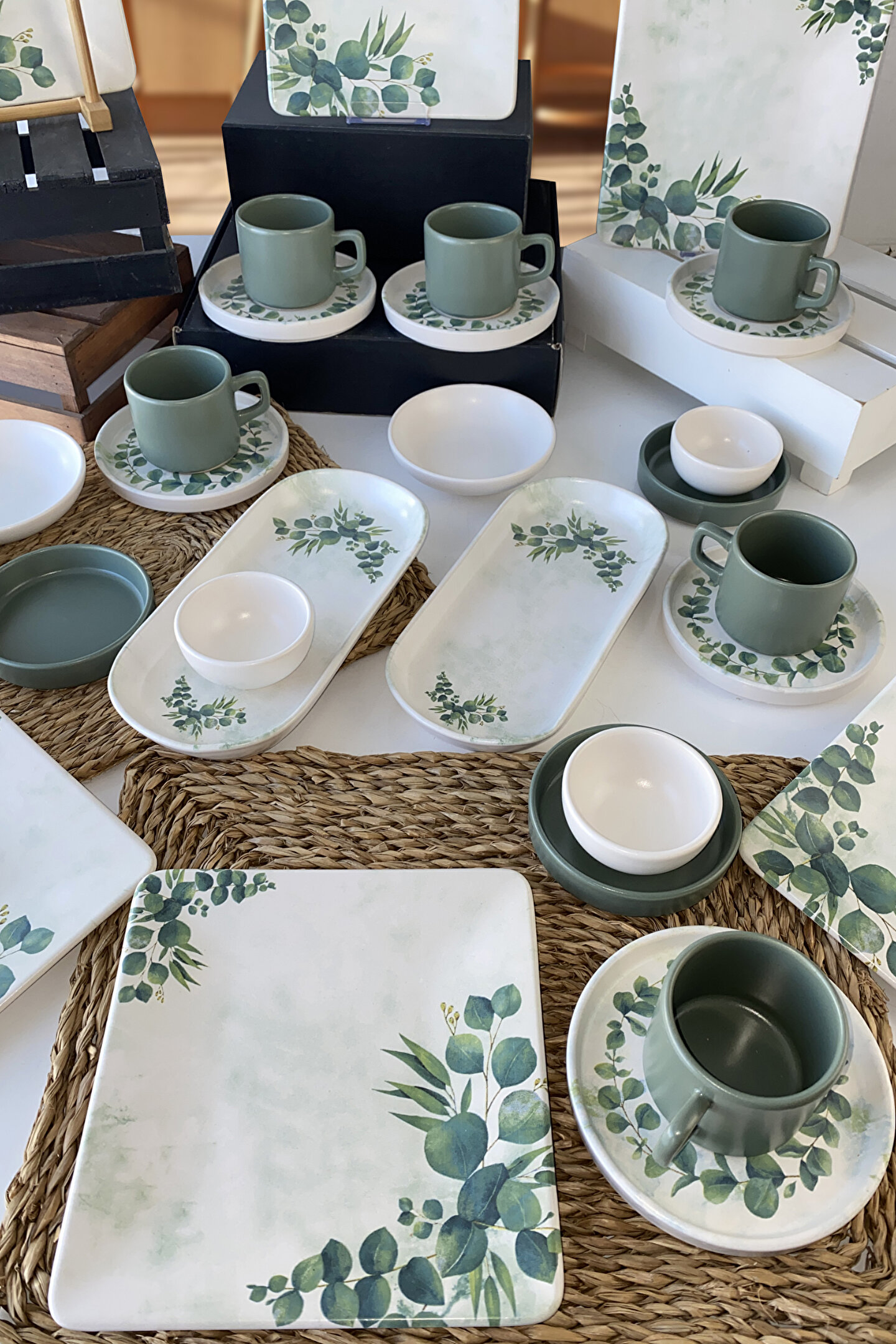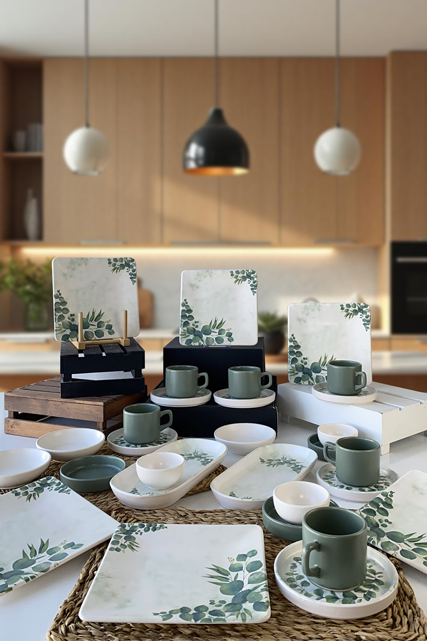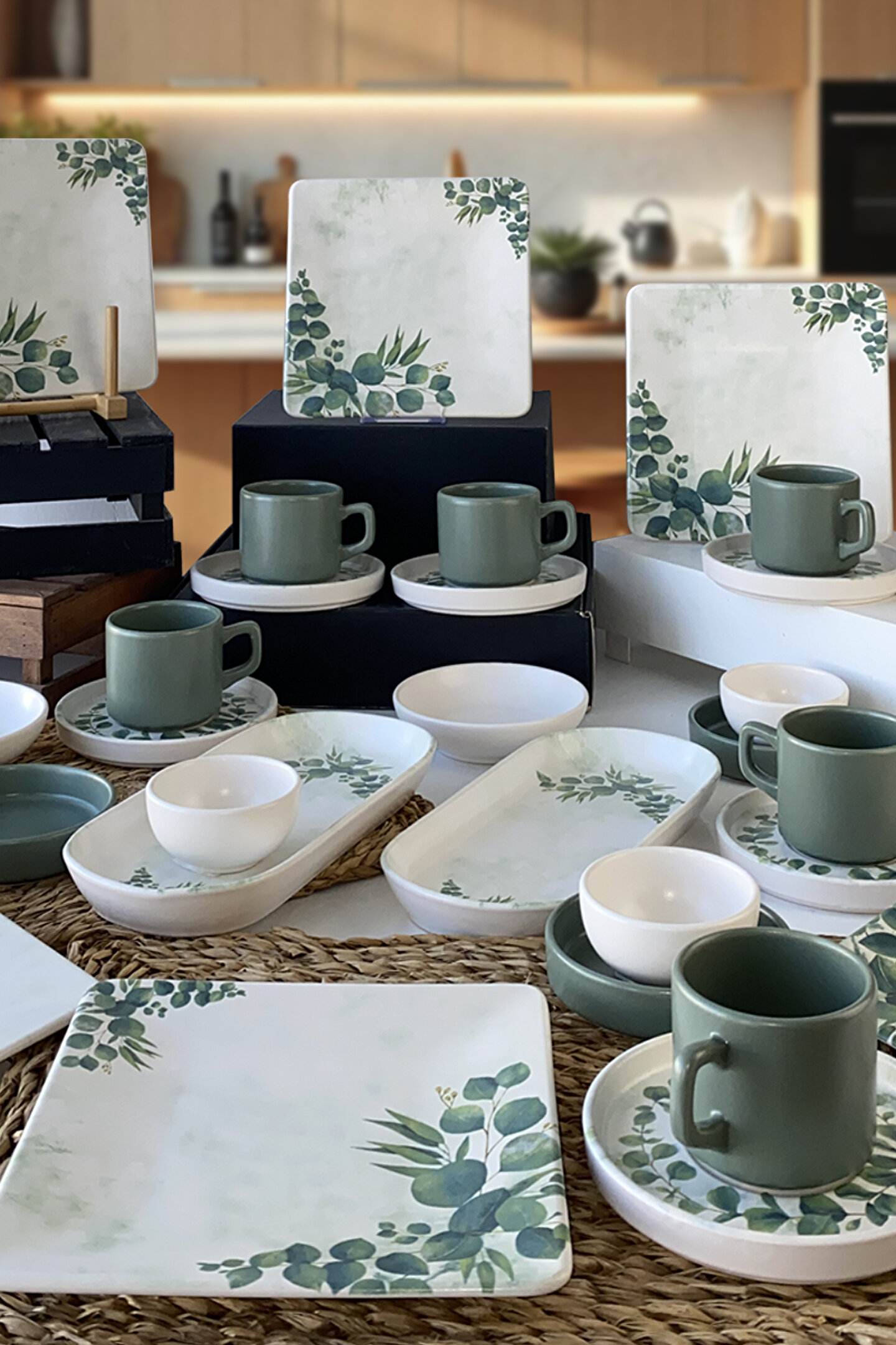 6 adet 20cm mat desenli tabak ; 6 adet çay fincanı yeşil ; 6 adet desenli çay tabağı ; 3 adet 13cm mat beyaz kase ; 3 adet 11cm mat yeşil kase ; 3 adet 8cm mat beyaz kase ; 2 adet 26cm mat desenli kayık ; Yüzey Yapısı : Mat renkli ; ; Renkleri ve baskısı solmaz.; ; Kolay temizlenir, mikrop barındırmaz.; ; Bulaşık makinesi normal ayarında yıkanabilir.; ; Tamamen sağlıklı ve ekolojik malzeme yapısına sahiptir.; ; Türkiye’de üretilmiştir.; ; Almış olduğunuz bu üründe kırık ürün değişim garantisi bulunmaktadır.; Koli içerisinde bilgilendirme broşürü yer almaktadır.; ; Taşıma esnasında kırılma riskine karşı güvenli paketleme yapılarak gönderimi sağlanmaktadır.