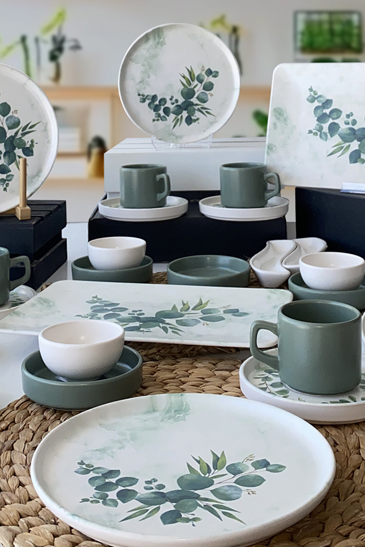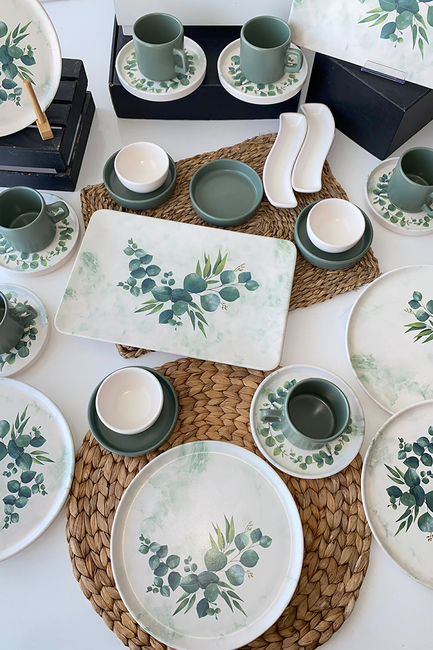 6 adet 22cm mat desenli tabak ; 6 adet mat yeşil çay fincanı ; 6 adet mat desenli çay tabağı ; 4 adet 11cm mat yeşil kase ; 3 adet 8cm mat beyaz kase ; 2 adet 31*21cm mat desenli kayık ; 2 adet mat beyaz zeytinlik; Yüzey Yapısı : Mat renkli ; Ürün kullanımı: Renkleri ve baskısı solmaz. ; Kolay temizlenir, mikrop barındırmaz. ; Bulaşık makinesi normal ayarında yıkanabilir. ; Tamamen sağlıklı ve ekolojik malzeme yapısına sahiptir. ; Türkiye’de üretilmiştir. ; Almış olduğunuz bu üründe kırık ürün değişim garantisi bulunmaktadır. Koli içerisinde bilgilendirme broşürü yer almaktadır. ; Taşıma esnasında kırılma riskine karşı güvenli paketleme yapılarak gönderimi sağlanmaktadır. ;