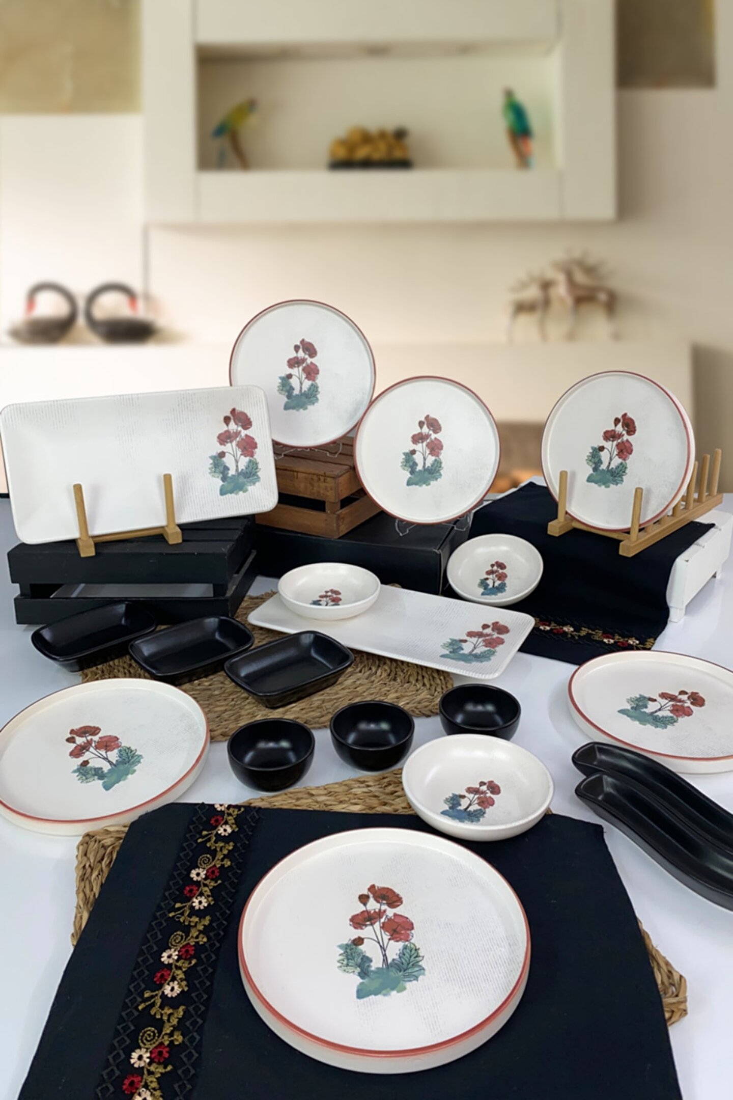 6 adet desenli 21cm kahvaltı tabağı ; 3 adet desenli 13cm kahvaltılık ; 3 adet mat siyah 8cm kahvaltılık ; 3 adet mat siyah 13cm dikdörtgen kahvaltılık; 2 adet desenli 33*17cm kayık ; 2 adet mat siyah zeytinlik ;