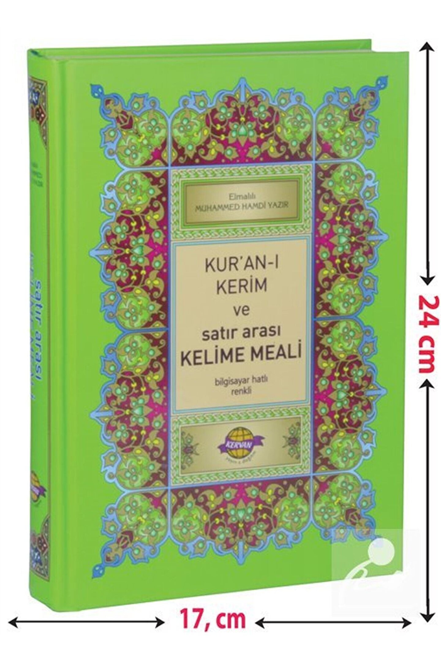 Kur'an-ı Kerim ve Satır Arası Kelime Meali Açıklamalı (Orta Boy) Kolektif, Elmalılı Hamdi Yazır / Kervan Yayın Dağıtm Basım Yılı: 2015; Sayfa Sayısı: 616; Kağıt Türü: Şamuha Kağıt; Ebat: 17 x 24; Dil: Arapça, Türkçe; Cilt Durumu: Ciltli; ISBN: 9789758896158; Renk: Renkli; Hazırlayan: Kolektif, Elmalılı Hamdi Yazır; Sadeleştiren: Yusuf Ertuğrul, Fahri Altunkaynak, A.; Cevad Karaman, Ahmet Öncel, Yasir Ünlü; Allah'u Tealanın Tevfik ve inayeti ile hazırladığımız bu Kur'ân-ı Kerim ve Türkçe Meali, dört değişik şekilde okunacak durumda hazırlanmıştır: a.; Kur'ân-ı Kerimi Arapça lafzı ile okumak.; b.; Yalnız Kur'ân'ın mealini okumak.; c.; Arapça lafzı ile beraber mealini okumak.; d.; Lafız ve meal kelime olarak aynı renkle renklendirildiğinden kelimenin lügat manasını anlayarak okumak.