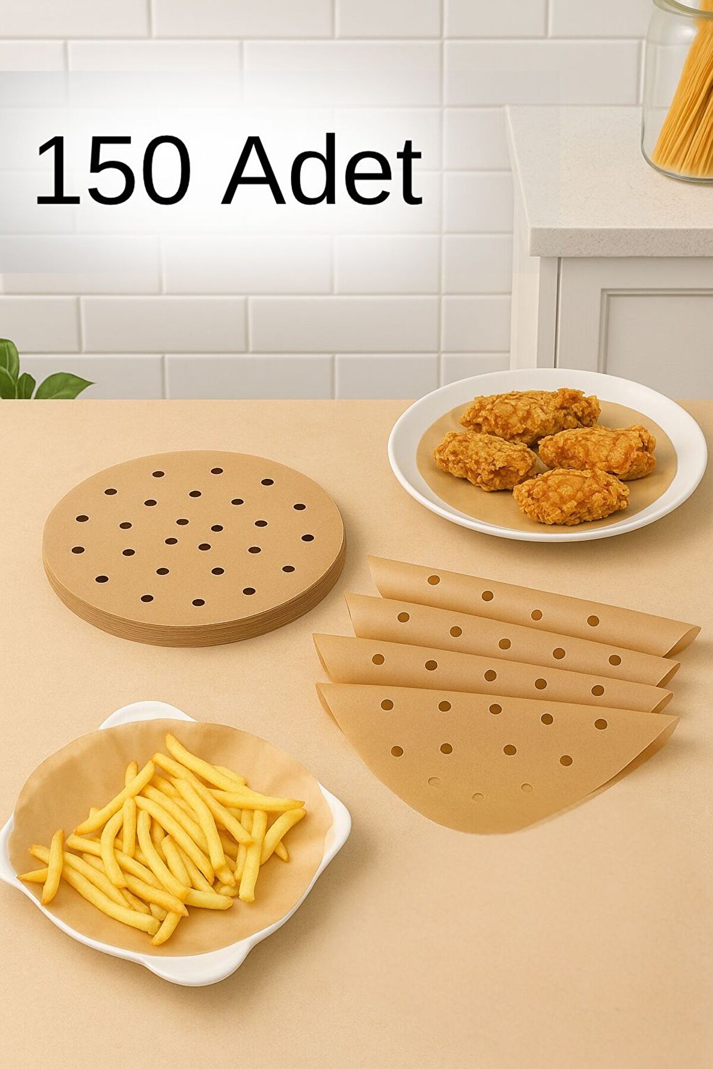 150 adet (3 × 50 paket) delikli yuvarlak airfryer yağlı pişirme kağıdı, kızartma, tavuk, patates, balık ve hamur işleri gibi yiyeceklerin pişirilmesinde mükemmel sonuç sunar.; Yüksek ısıya dayanıklı, gıda temasına uygun ve yapışmaz yüzeyi sayesinde airfryer, fırın, buharlı pişirici ve buharlı tencerelerde güvenle kullanılabilir.; Delikli tasarım, sıcak havanın eşit şekilde dolaşmasını sağlayarak yiyeceklerin her tarafının eşit pişmesini sağlar.; Tek kullanımlık ve hijyenik yapısıyla mutfakta temizlik kolaylığı sunar.; İhtiyaca göre az kirlenmiş kağıtlar tekrar kullanılabilir.; ; Ürün Özellikleri •Paket İçeriği: 3 × 50 adet (Toplam 150 adet) yuvarlak delikli pişirme kağıdı •Malzeme: Gıda temasına uygun yağ geçirmez kağıt •Kullanım Alanı: Airfryer, fırın, buharlı pişirici, buharlı tencere •Yüksek ısıya dayanıklı, yapışmaz yüzey •Delikli tasarım ile eşit pişirme sağlar •Tek kullanımlık, isteğe bağlı yeniden kullanılabilir •Patates kızartması, tavuk, balık, pizza ve hamur işleri için ideal