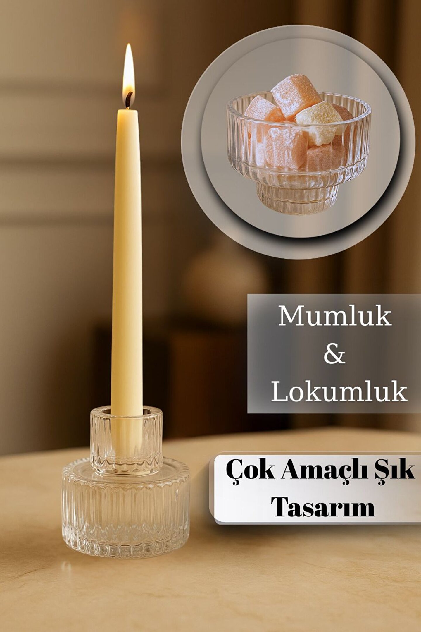 Çok amaçlı cam tasarımı sayesinde hem mumluk hem de lokumluk olarak kullanılabilen bu şık obje, dekorasyonunuza zarif bir dokunuş katar.; İnce cam işçiliği ile tasarlanmış ürün, sofralarınızda lokum, şeker veya çikolata sunumları için kullanılabilir.; Aynı zamanda mum ile birlikte dekoratif bir ambiyans oluşturur.; Hem işlevsel hem estetik yapısıyla misafir sunumları ve ev dekorasyonu için idealdir.; ⸻ ✅ Ürün Özellikleri: • Çok amaçlı kullanım: Mumluk & lokumluk • Yüksek kaliteli şeffaf cam malzeme • Zarif ve modern tasarım • Misafir ikramlıkları ve dekoratif kullanım için uygun • Dayanıklı ve uzun ömürlü