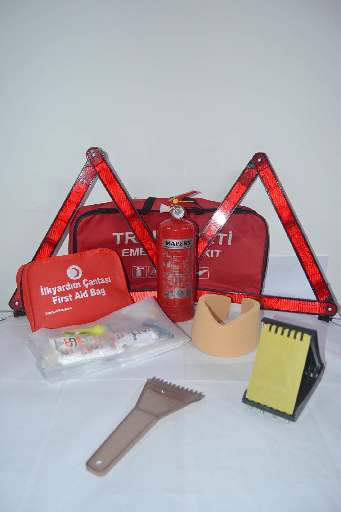 Ekonomik trafik ve ilkyardım seti çantası içeriği; 1 adet 1 kg çakır kkt yangın söndürme tüpü,2 adet metal ayaklı katlanır araç reflektörü,1 adet boyunluk,1 adet çivili katlanır araç kaydırmaz takoz,1 adet buz kıracak, ilkyardım seti çantası içeriği: 1 adet ilk yardım örtüsü,1 adet 10x10 cm tek kat kompres1 adet elastik bandaj1 adet ilk yardım turnikesi2 adet 10x350 cm hidrofil sargı bezi1 adet el feneri - Pili dahildir,10 adet yarabandı,1 adet makas,1 adet ilk yardım bandı1 çift eldiven,2 adet antiseptik solisyon - Batiqonix,10 adet mini çengelli iğne,2 adet üçgen sargı bezi