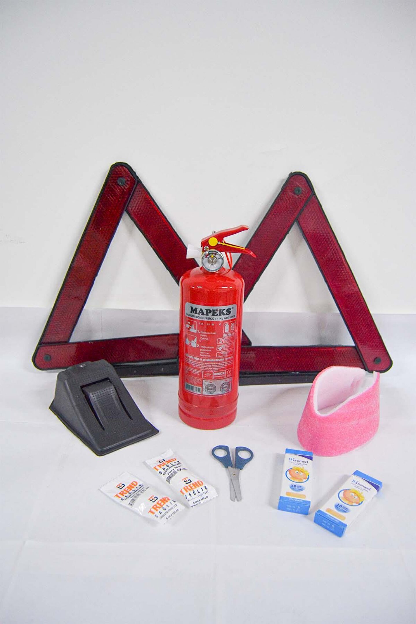 Ekonomik Trafik ve İlkyardım Seti; 1 adet 1 kg KKT mapeks yangın söndürme tüpü, 2 adet eko araç reflektörü, 1 adet boyunluk, 1 adet araç kaydırmaz takoz, 2 adet yarabandı, 1 adet 5x150 cm hidrofil sargı bezi, 1 adet makas Çantalı olarak gönderilecektir.