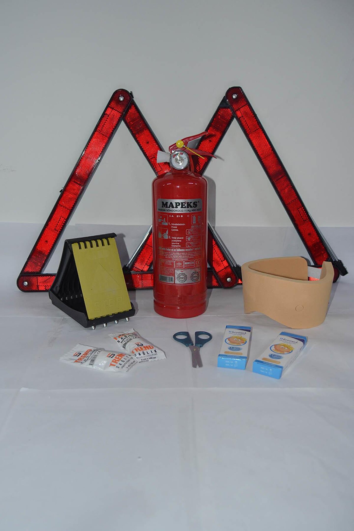 Ekonomik Trafik ve İlkyardım Seti; 1 adet 1 kg Mapeks KKT yangın söndürme tüpü, 2 adet metal ayaklı katlanır araç reflektörü, 1 adet boyunluk, 1 adet çivili katlanır araç kaydırmaz takoz, 2 adet yarabandı, 1 adet 5x150 cm hidrofil sargı bezi, 1 adet makas