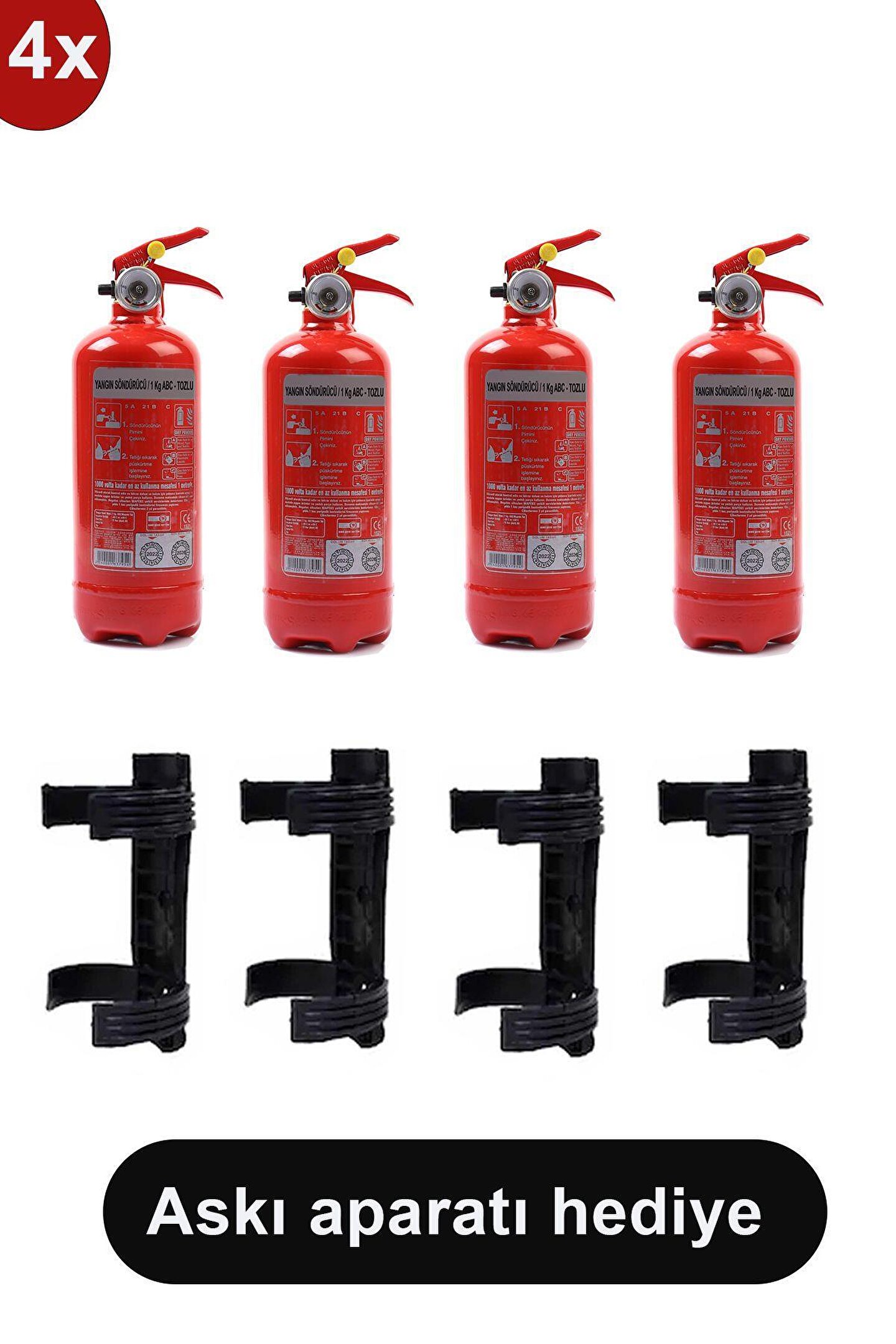 Yangın Tüpü Söndürücü Askısı Plastik 4 adet , 1 kg 4 Adet Araç Tüpü 4 Yıl Garantili 2022 Üretim 2026 Tekrar Dolum Kuru kimyevi tozlu yangın söndürme tüpü - 1 kg. Abc kuru kimyevi tozlu yangın söndürme cihazı (araçlarda ve otomobilerde kullanım için uygundur); * yangın söndürmede kullanılan ve kuru kimyevi toz veya abc olarak adlandırılan etken madde "mono amonyum fosfat" tır. Satın alacağınız yangın söndürücünün içerisindeki map oranına ve tse belgeli olmasına dikkat ediniz. Özellikler: 1 kg kapasiteli ; * dolum tarihi 2022 tekrar dolum tarihi 2026 olarak etiketlidir. ; A1 71 14 kalite sıvama saçtan gövde gazaltı kaynak prinç tetik vana tertibatı ithal manometre abc söndürücü toz % 40 map oranı 18 bar çalışma basıncı özel montaj askısı yangın tüpünün üzerindeki basınç göstergesi (manometre) sayesinde basınç miktarını her zaman görebilirsiniz. Tekrar doldurulabilir bir yapıya sahiptir. Iso 9001-2000 kalite standartlarında üretilmiştir. Tse ve ce belgelidir. Kullanıldığı yangın sınıfları: A sınıfı yangınlar: Katı madde yangınları b sınıfı yangınlar: Sıvı yanıcı maddeler, akaryakıt yangınları c sınıfı yangınlar: Gaz yangınları kullanım şekli: Emniyet pimini çekiniz. Rüzgarı arkanıza alarak yangın söndürme cihazını ateşin olduğu yöne doğru tutunuz. Tüpün tetiğine basarak yangına müdahale ediniz. ;