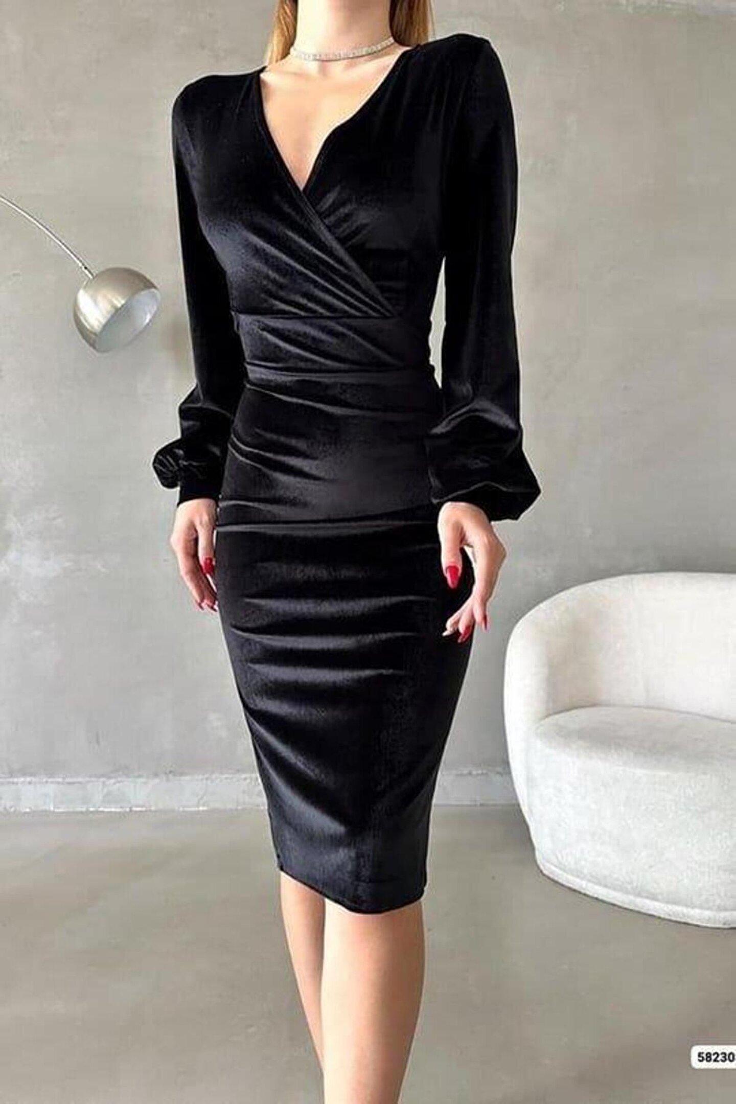 KOZMERA BUTİK Kadın Kadife Kumaş Kruvaze Yaka Balon Kol Ve Yırtmaç Detaylı Midi Boy Elbise