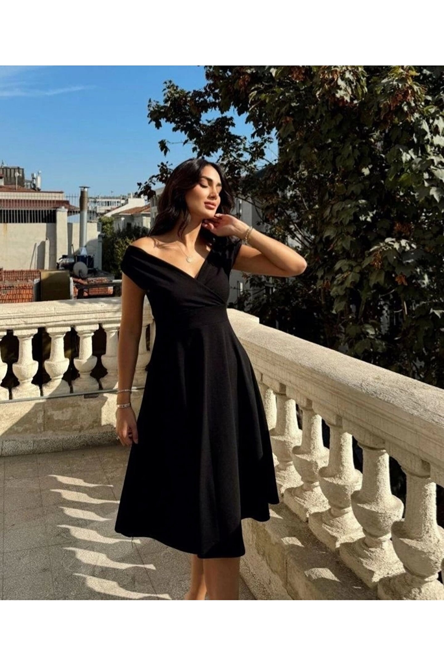 Kadın Kısa Kollu Kruvaze Yaka Eteği Volanlı Krep Elbise