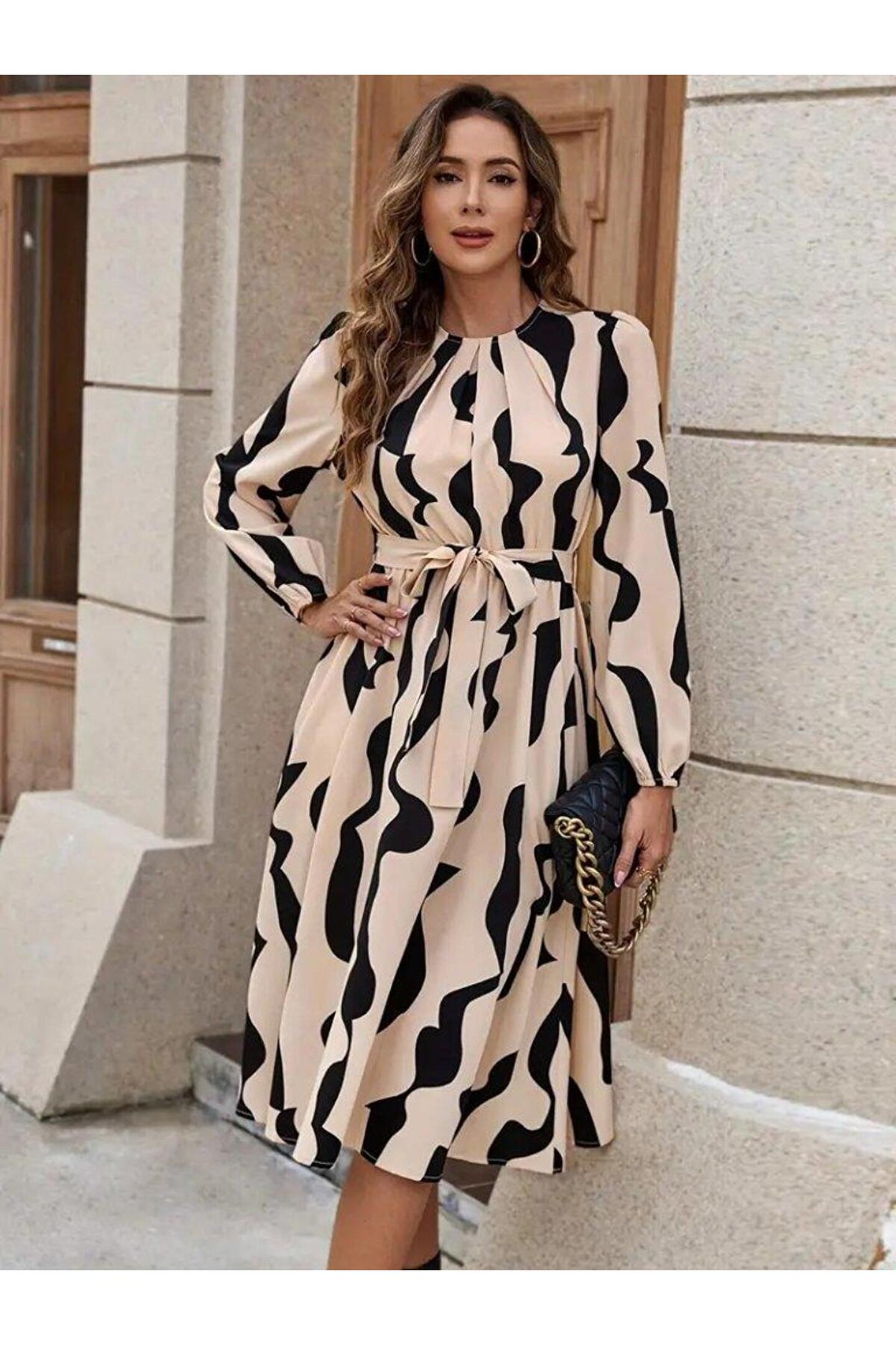 Kadın Uzun Kollu Bisiklet Yaka Belden Bağlamalı Desenli Belden Kuşaklı Mikro Süprem Midi Elbise