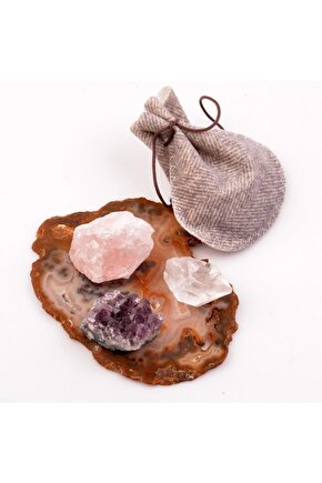 Bu Üründe Kullanılan Doğal Taşlar: İşlenmemiş Pembe Kuvars Taşı, Kristal Kuvars Taşı, Ametist Taşı Bu Üründe Kullanılan Doğal Taş Boyutu: · Ortalama En: 3 cm · Ortalama Boy: 4 cm Doğal Taşların Ortalama Ağırlığı: Ametist Taşı: 30 gr Kristal Kuvars Taşı : 15 gr Pembe Kuvars Taşı :30 gr Not: Ürünler doğal taş olduğu için renk tonları ve şekiller küçük farklılıklar gösterebilir; Bir kese içinde fotoğrafta görünen 3 adet işlenmemiş ham doğal taş size ulaşacaktır, kese rengi ve şekli stok durumuna göre farklılık gösterebilir; ;;