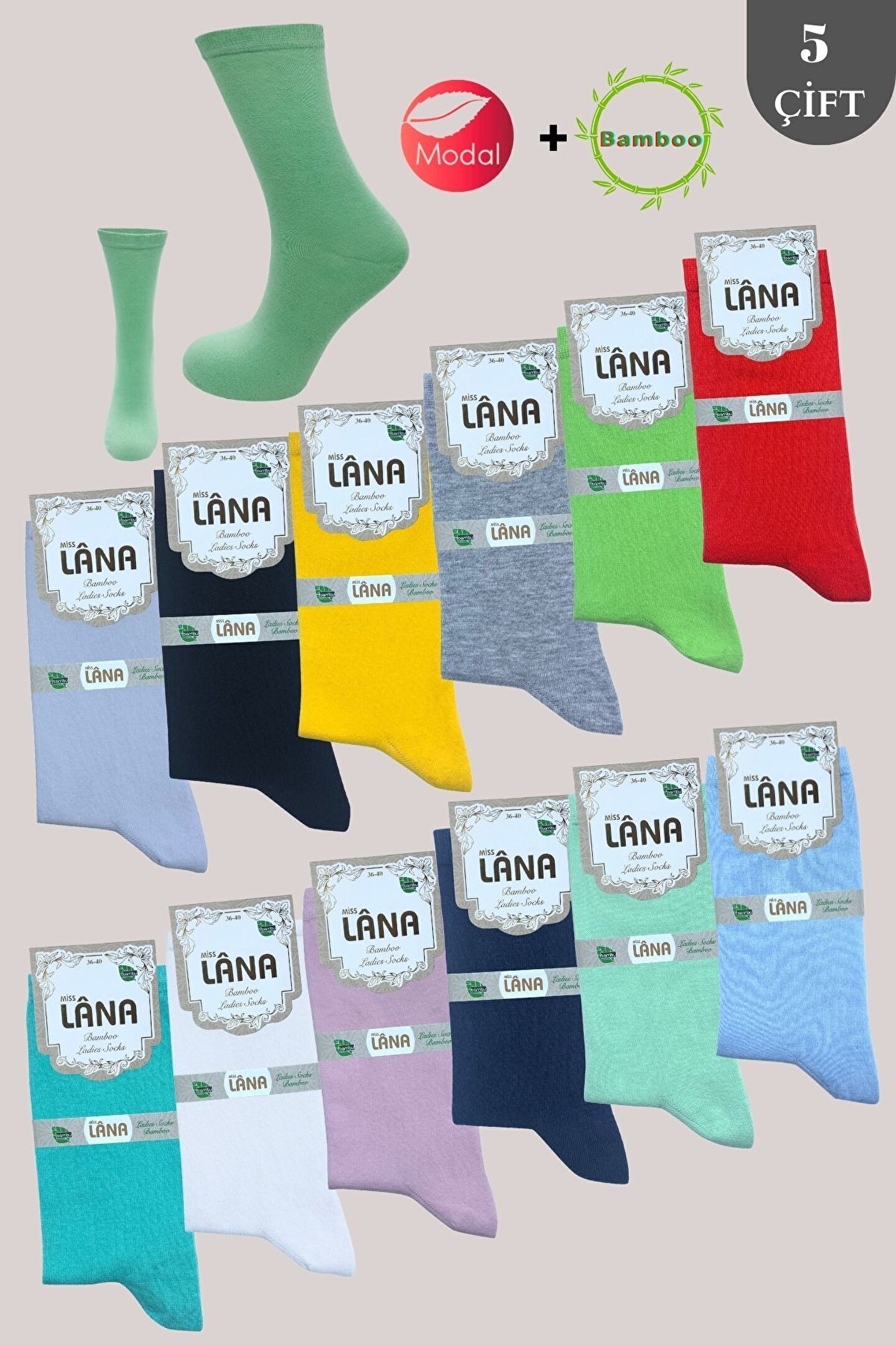 Kadın Çorabı (Bambu + Modal) Ter Emici Dikişsiz Trend Model Soket Uzun Çorap (5 ÇİFT) Asorti Renk