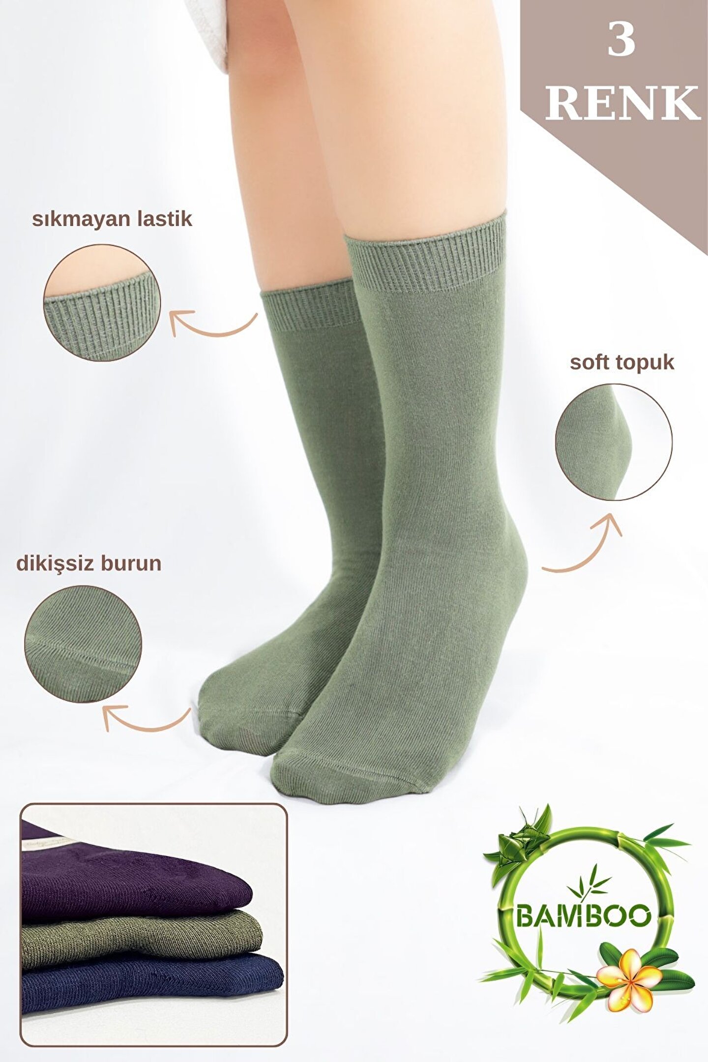 Kadın Çorabı Ter Emici Dikişsiz Extra Soft Model Soket Uzun Bambu Çorap (3 ÇİFT) Asorti Renk