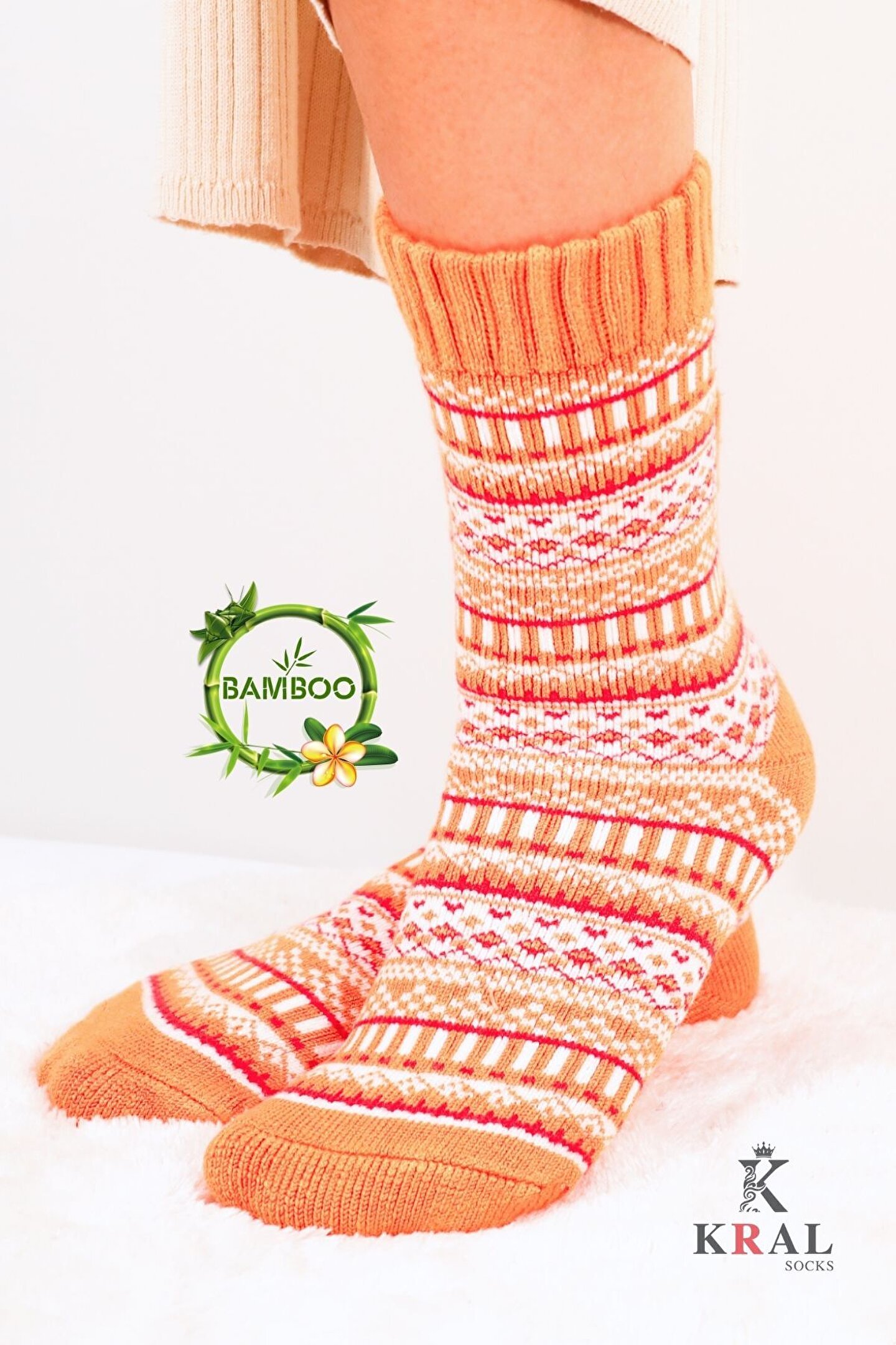 KRAL SOCKS Özel Üretim (3 Çift) Kalın Kışlık %100 Yün Çizgili - Motif Desenli Çorap