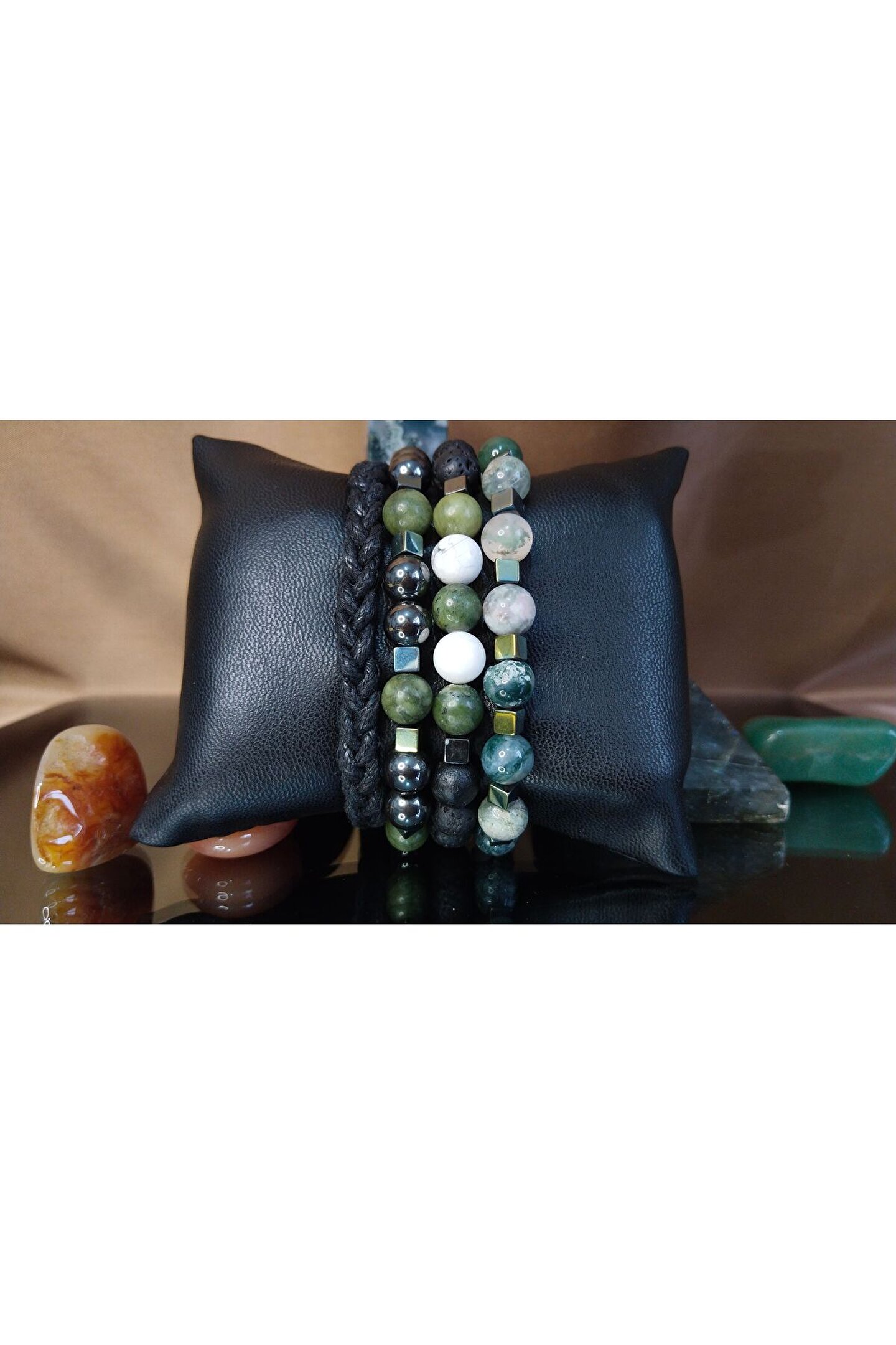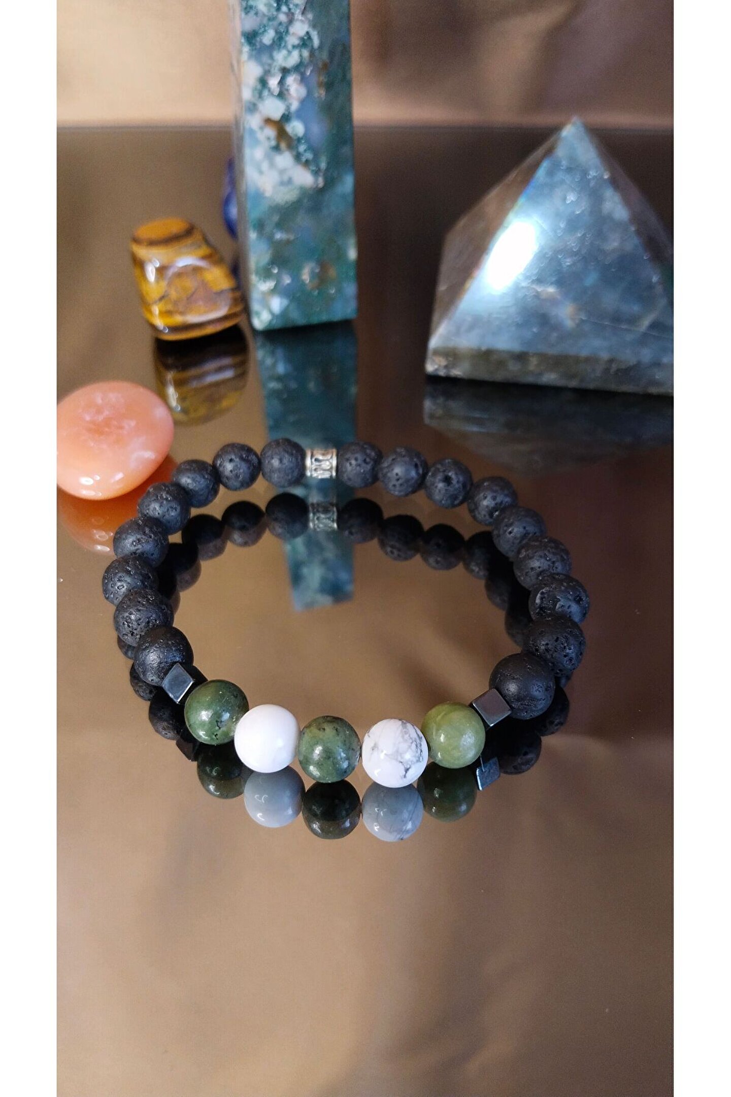 Erkek Doğal Taş Sertifikalı Bileklik. Hematit, Akik, Yeşim, Havlit, Lav Taşı, Deri Bileklik