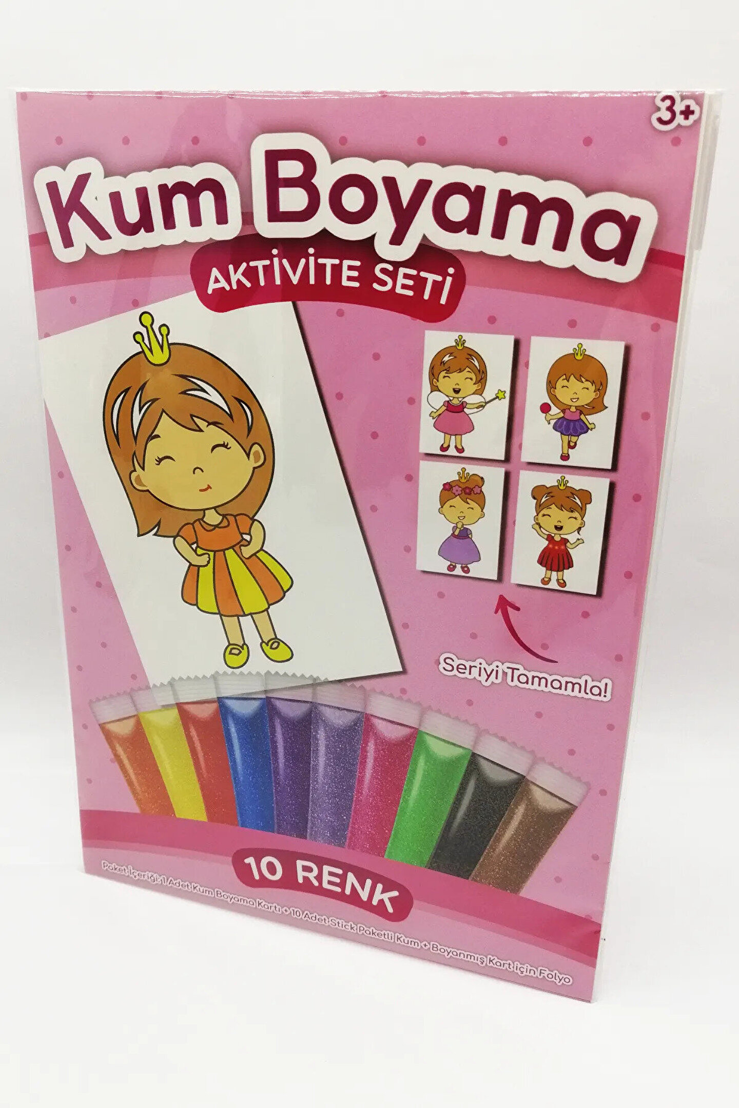 Kum Boyama : Kendinden yapışkanlı ve resimli kartların, renkli kumlarla boyama tekniğidir.; Kartın üzerindeki resim, bir şablon şeklinde, yarı kesik parçalar halindedir.; Sıra ile parçalar kaldırılarak, her kaldırma işleminden sonra renkli kum serpilmek suretiyle boyama yapılır ve tamamlanır.; 3 yaş üzeri uygundur.; Ürünümüz CE belgelidir.; Ayrıca, Avrupa Oyuncak Standartı EN-71,72,73 e uygundur.; Paket İçeriği : * 1 Adet Kum Boyama Kartı ( 23,5cm x 33,0cm, yaklaşık A4 ).; * 10 Adet ( renk ) şeffaf Stick Paketli Renkli Kum ( yaklaşık 7'şer gram ).; * 1 adet Boyanmış Kart için şeffaf Folyo.; * Kürdan.