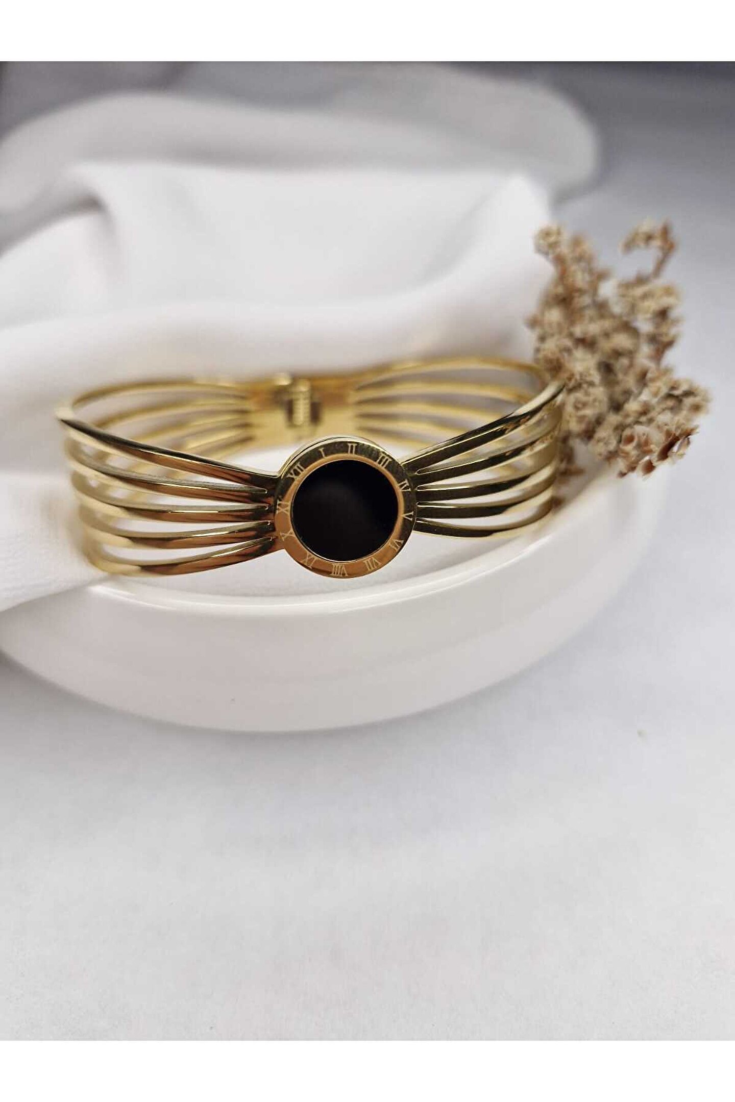 316L Paslanmaz çelikten üretilmiştir.; Zarif ve modern tasarımıyla dikkat çeken bu altın ton kelepçe bileklik, ortasında yer alan siyah yuvarlak taş ve Roma rakamlı halka detayıyla şıklığa sofistike bir dokunuş katıyor.; Geniş şeritli formu sayesinde bilekte güçlü bir duruş sergilerken, minimalist tasarımı sayesinde günlük hayatta ve özel günlerde rahatlıkla kullanılabilir.; Paslanmaz çelik yapısı sayesinde uzun ömürlüdür, kararma ve renk atma yapmaz.;