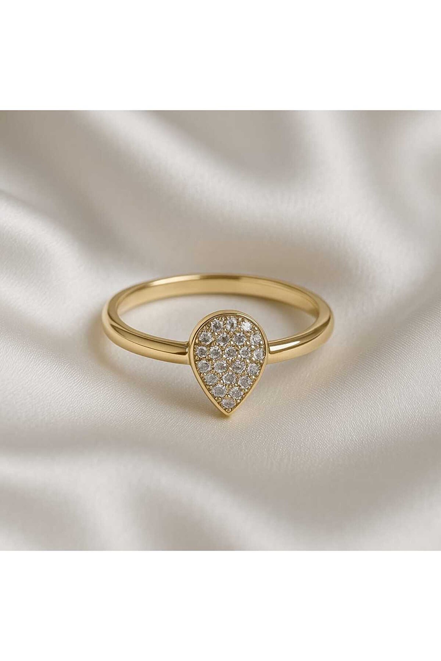 Zarif damla formunda tasarlanan bu yüzük, parlak zirkon taşların ışıltısıyla göz alıcı bir şıklık sunar.; Altın kaplama yapısı sayesinde uzun ömürlüdür.; Özel davetlerde stilinizi tamamlar.; Ayarlanabilir özelliği sayesinde her parmak ölçüsüne uygundur.;