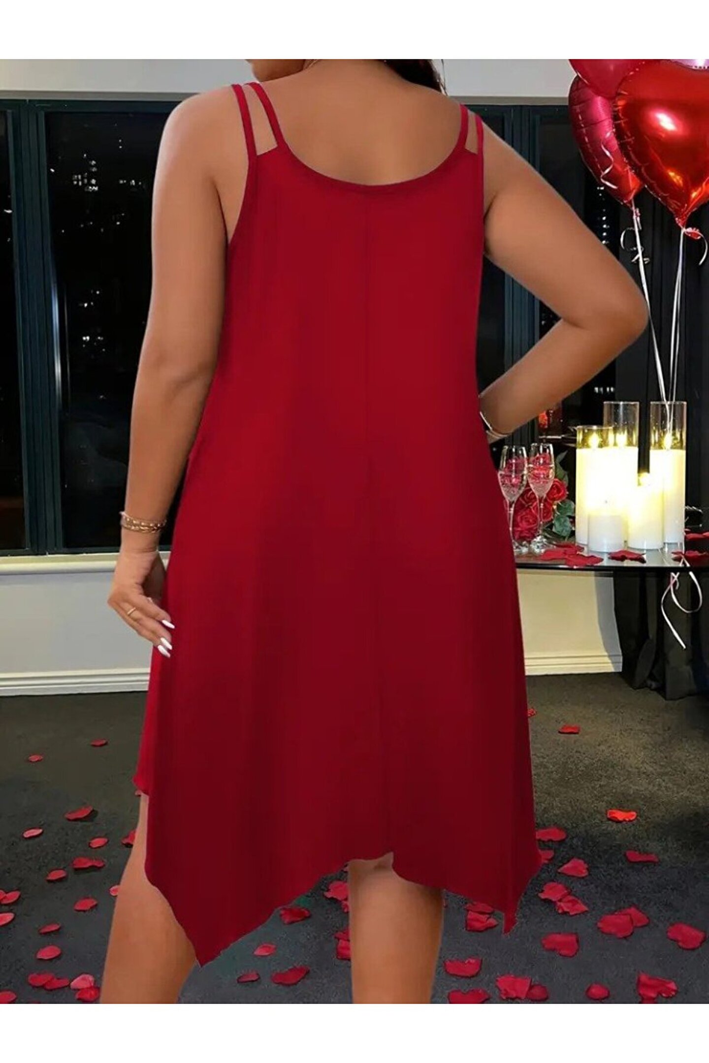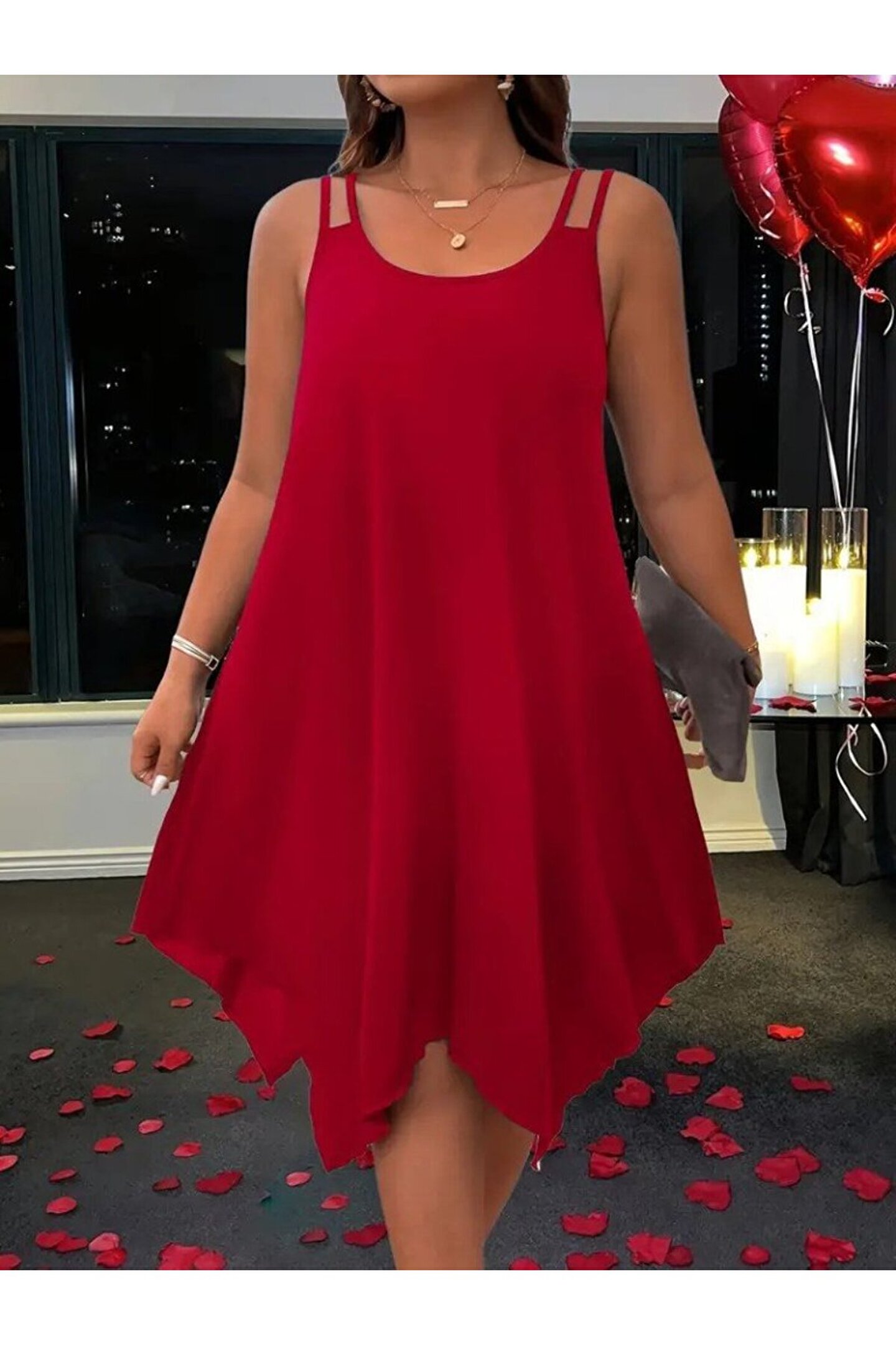 Kadın Askılı Yuvarlak Asimetrik Kesim Detaylı Viskon Elbise