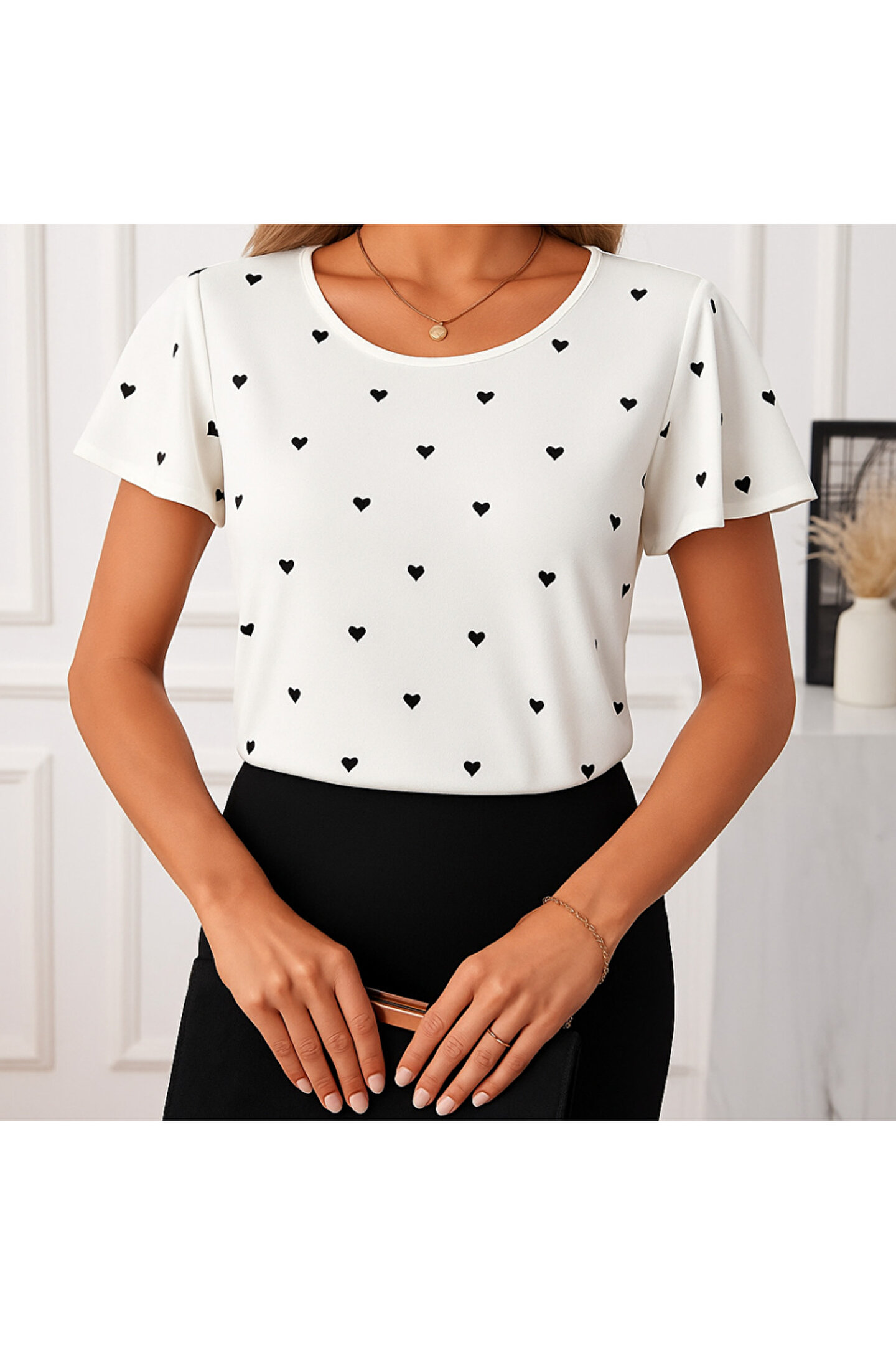 Kadın Kısa Kelebek Kollu Bisiklet Yaka Kalp Desenli Süprem Bluz