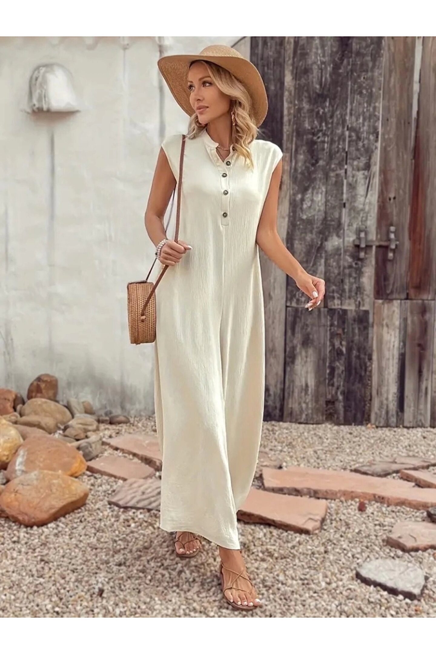 Kadın Kısa Kollu önden Düğmeli Paçaya Doğru Geniş Cepli Uzun Bürümcük Tulum