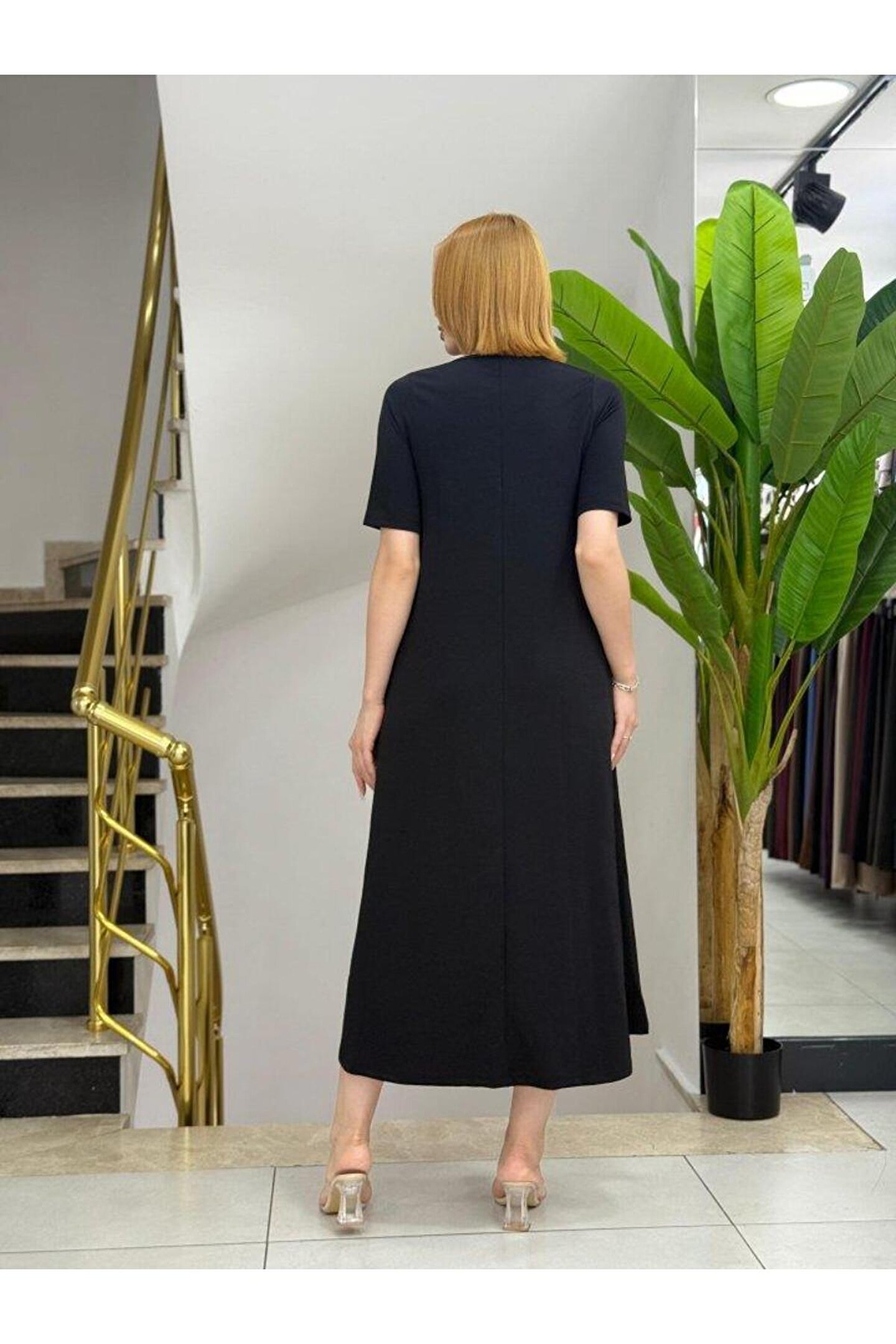 Kadın Kısa Kollu V Yakalı Cep Detaylı Uzun Janjan Krep Elbise