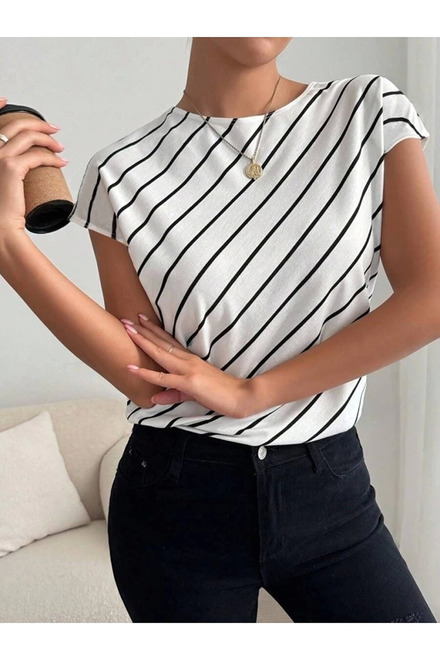 Kadın Kısa Yarasa Kollu Bisiklet Yaka çizgi Desenli Atlas Bluz