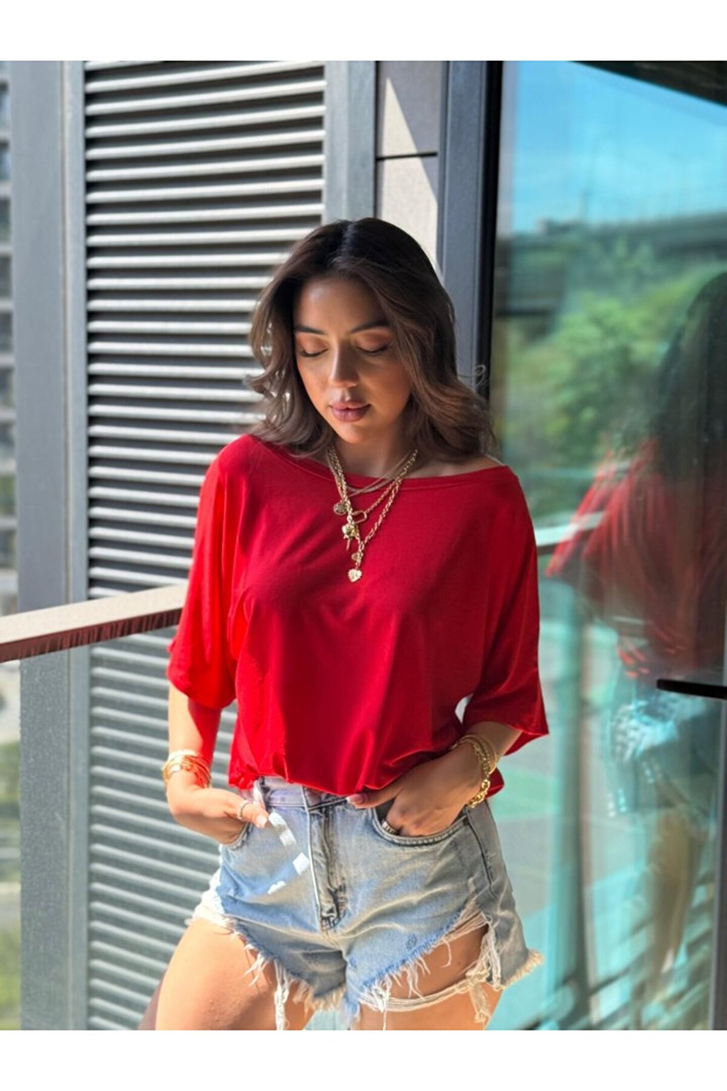 Kadın Tek Omuzu Açık Kısa Kollu Salaş Viskon Bluz