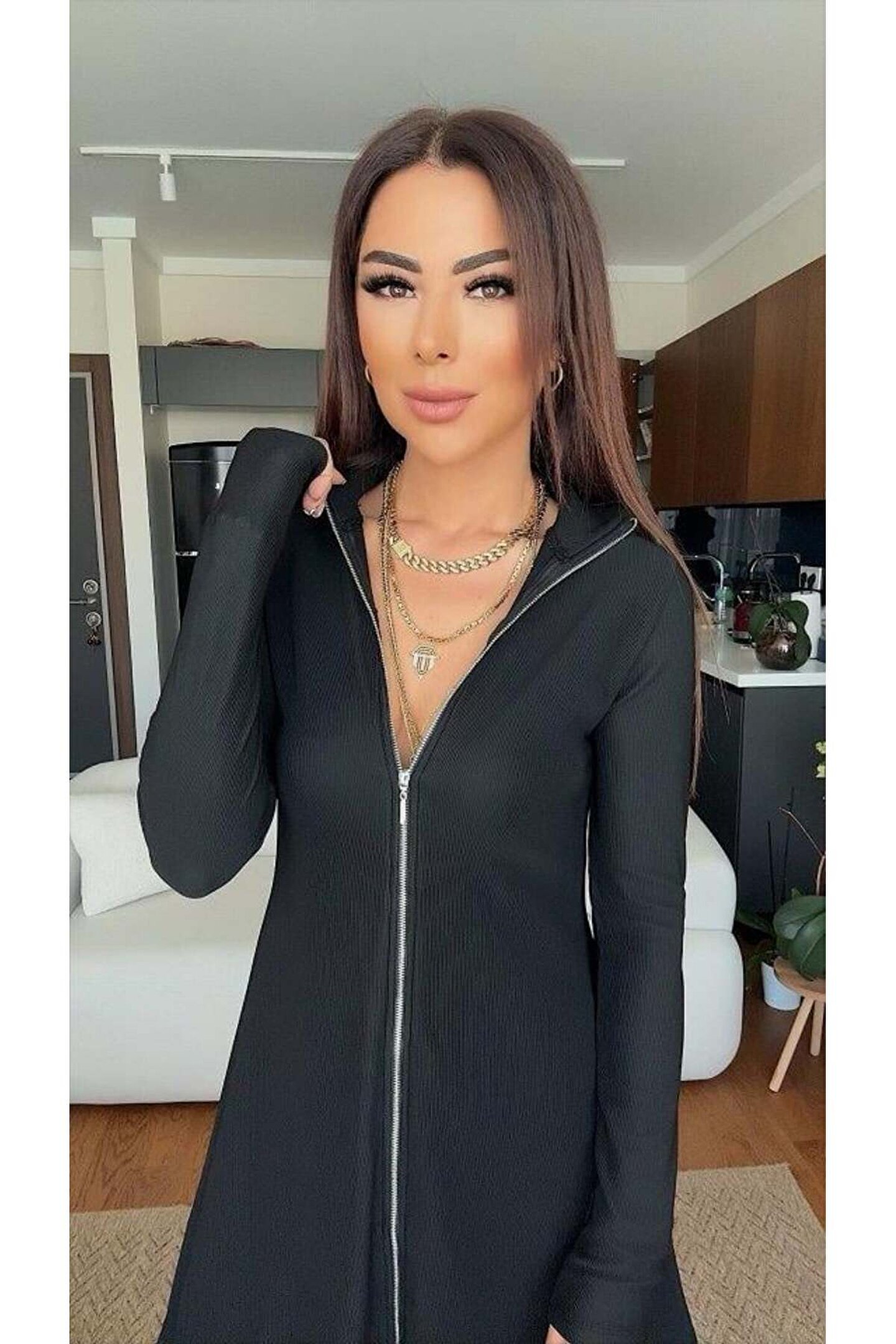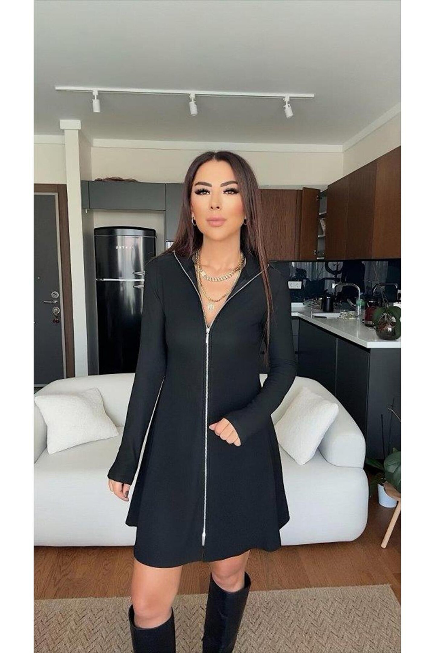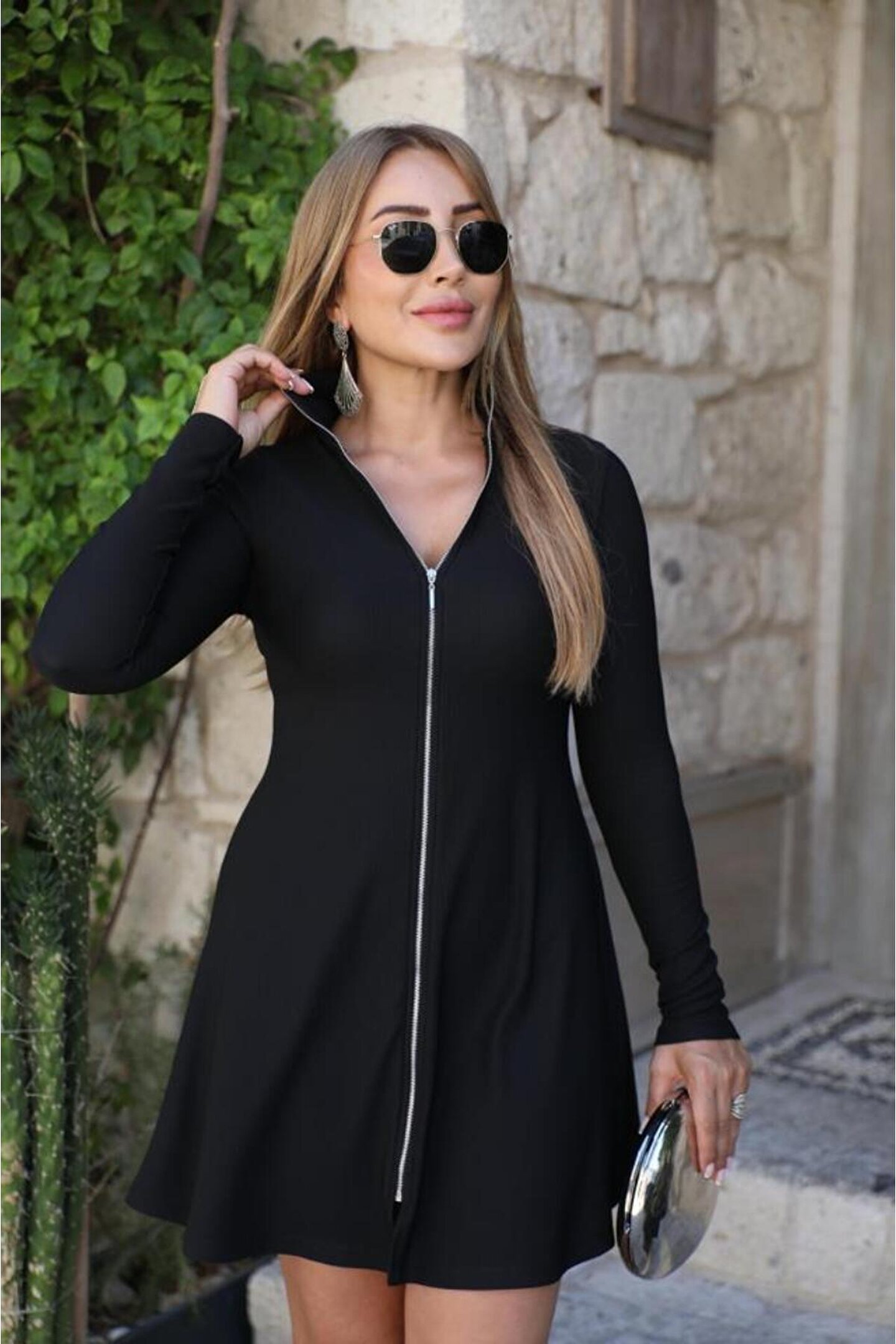 Kadın Uzun Kollu Hakim Yaka Ayarlanabilir Fermuar Dekolteli Mini Elbise