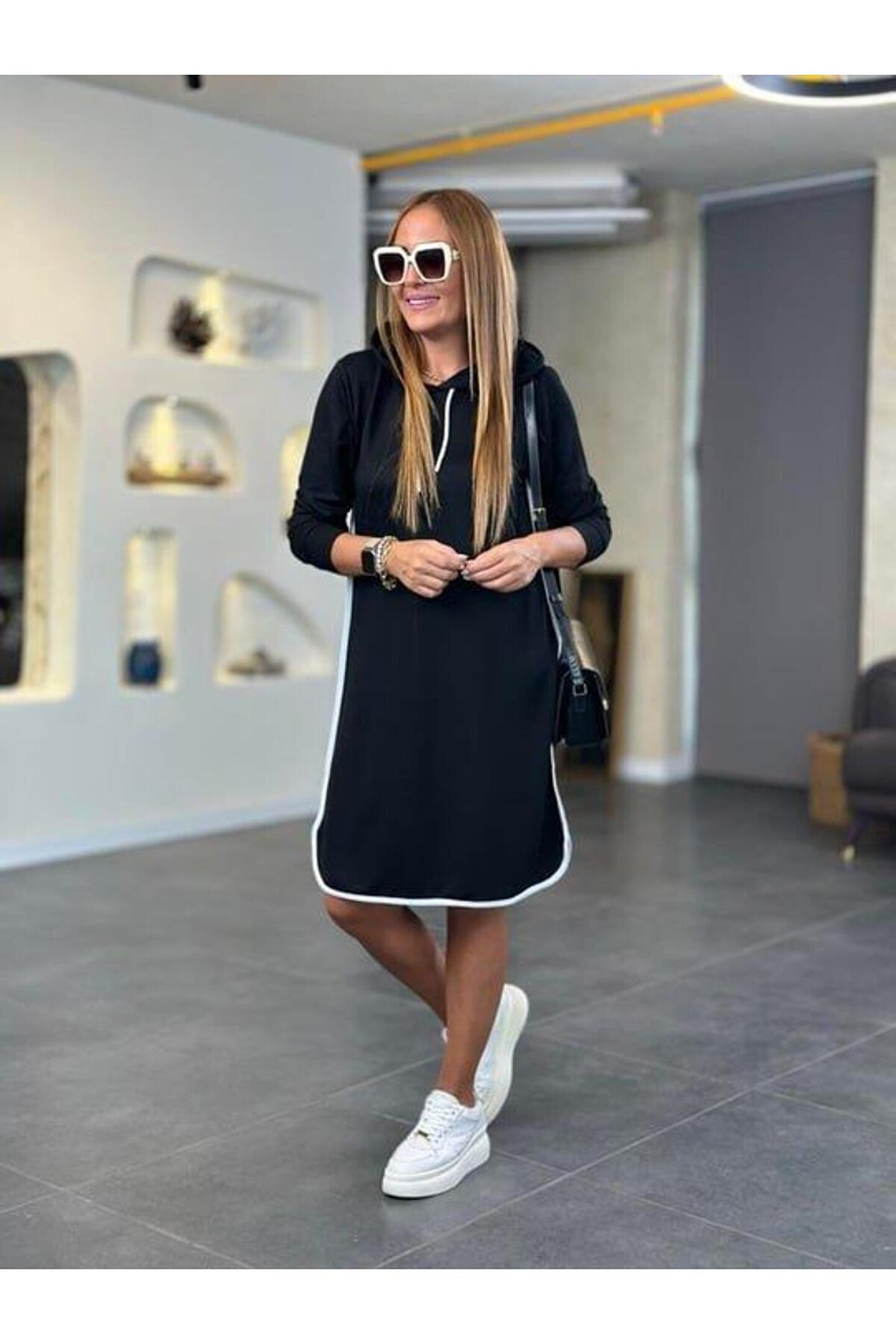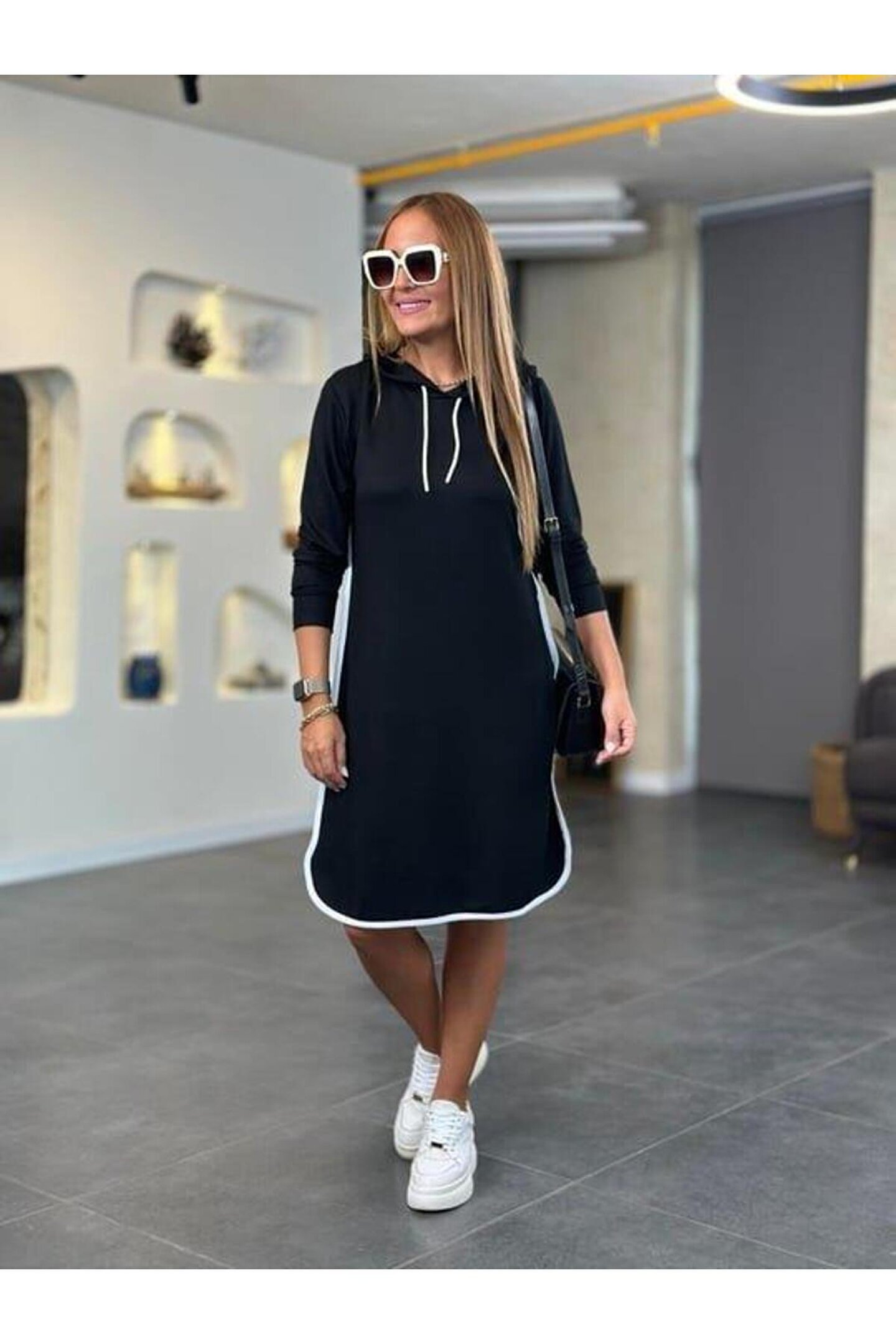 Kadın Uzun Kollu Kapüşon Ve Ribana Detay Diz üstü Elbise