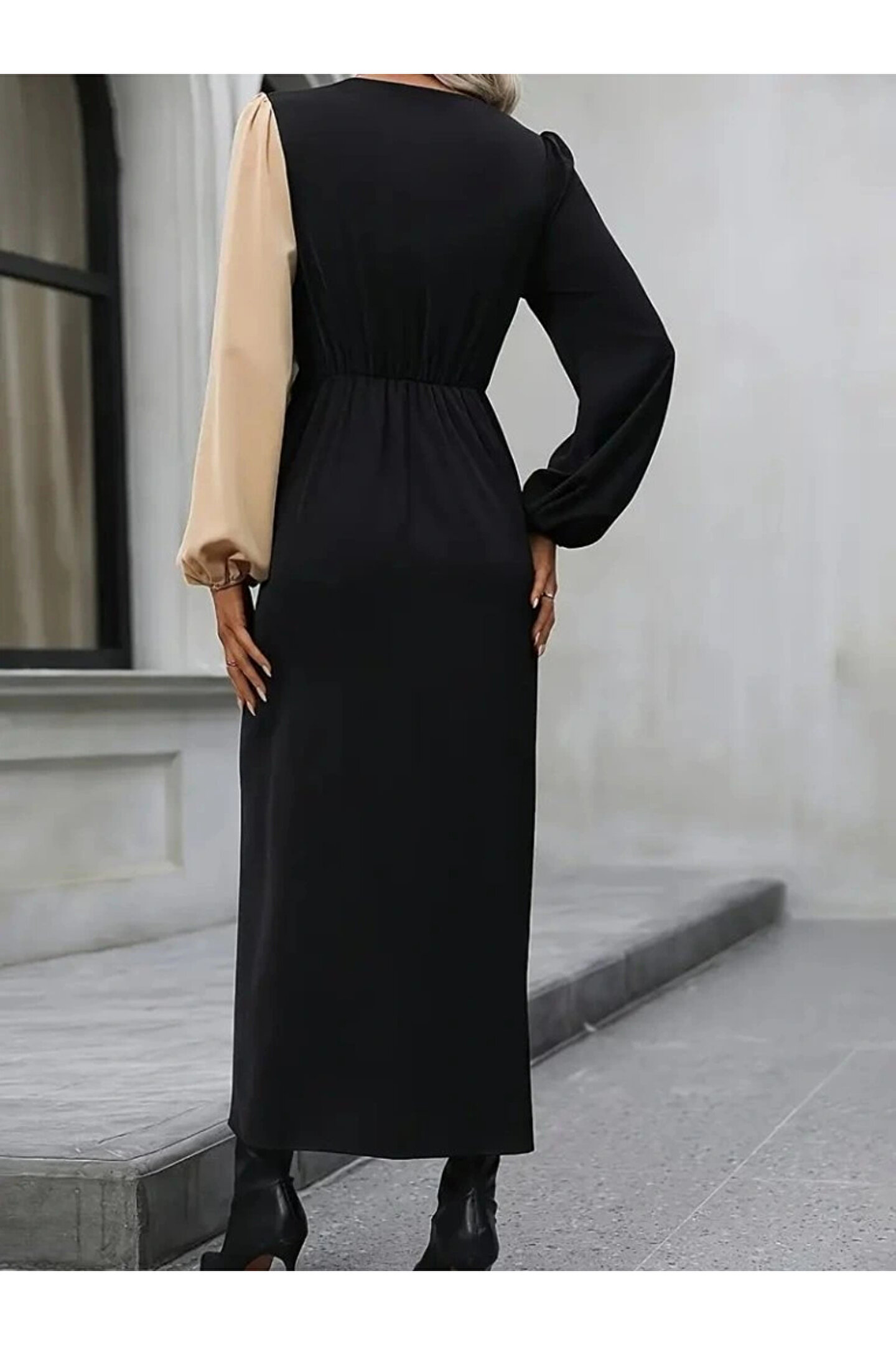 Kadın Uzun Kollu Kruvaze Yakalı Belden çapraz Detaylı çift Renkli Midi Ithal Krep Elbise