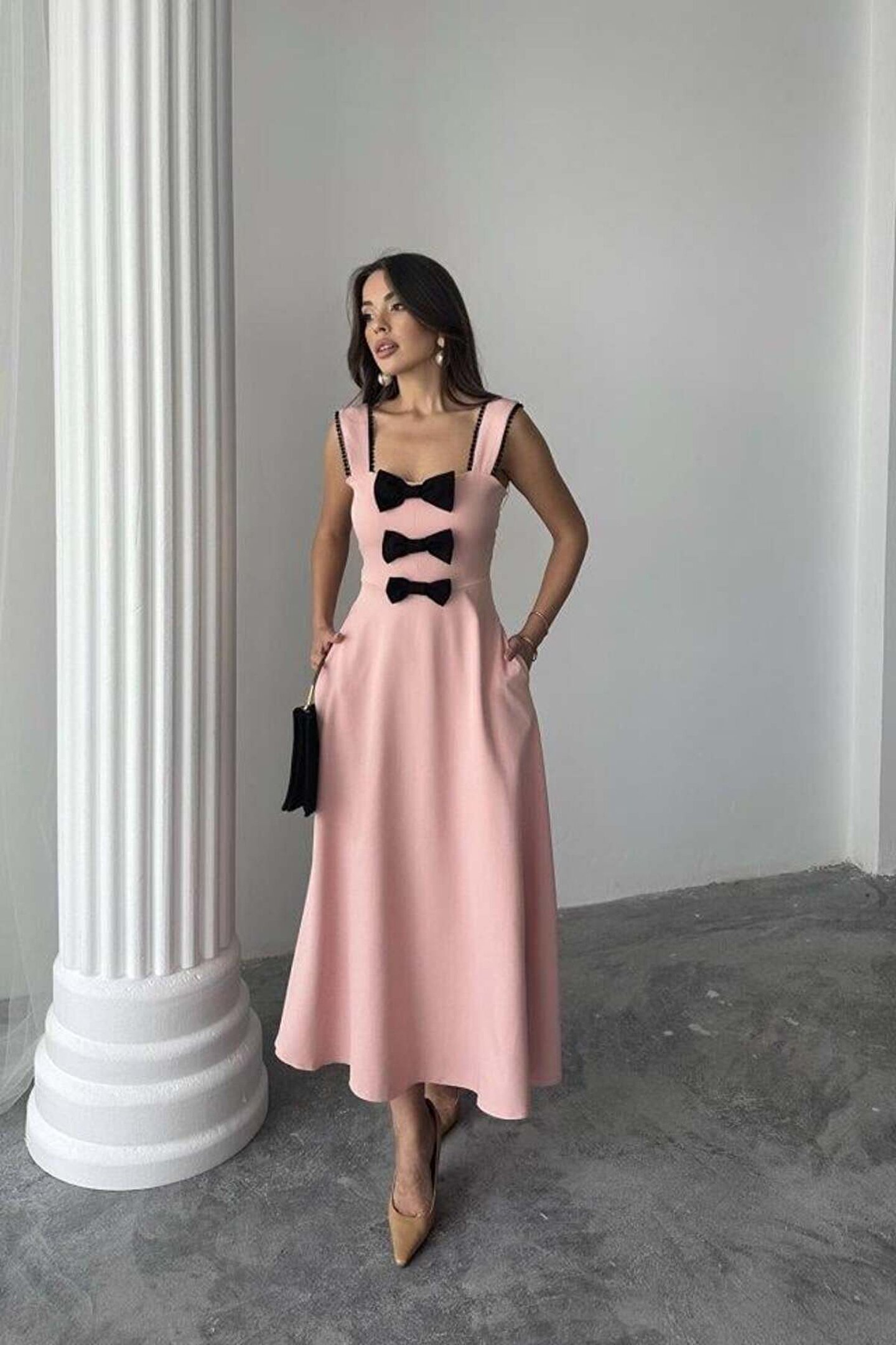 Pudra Fiyonk Garnili Dantelli Elbise