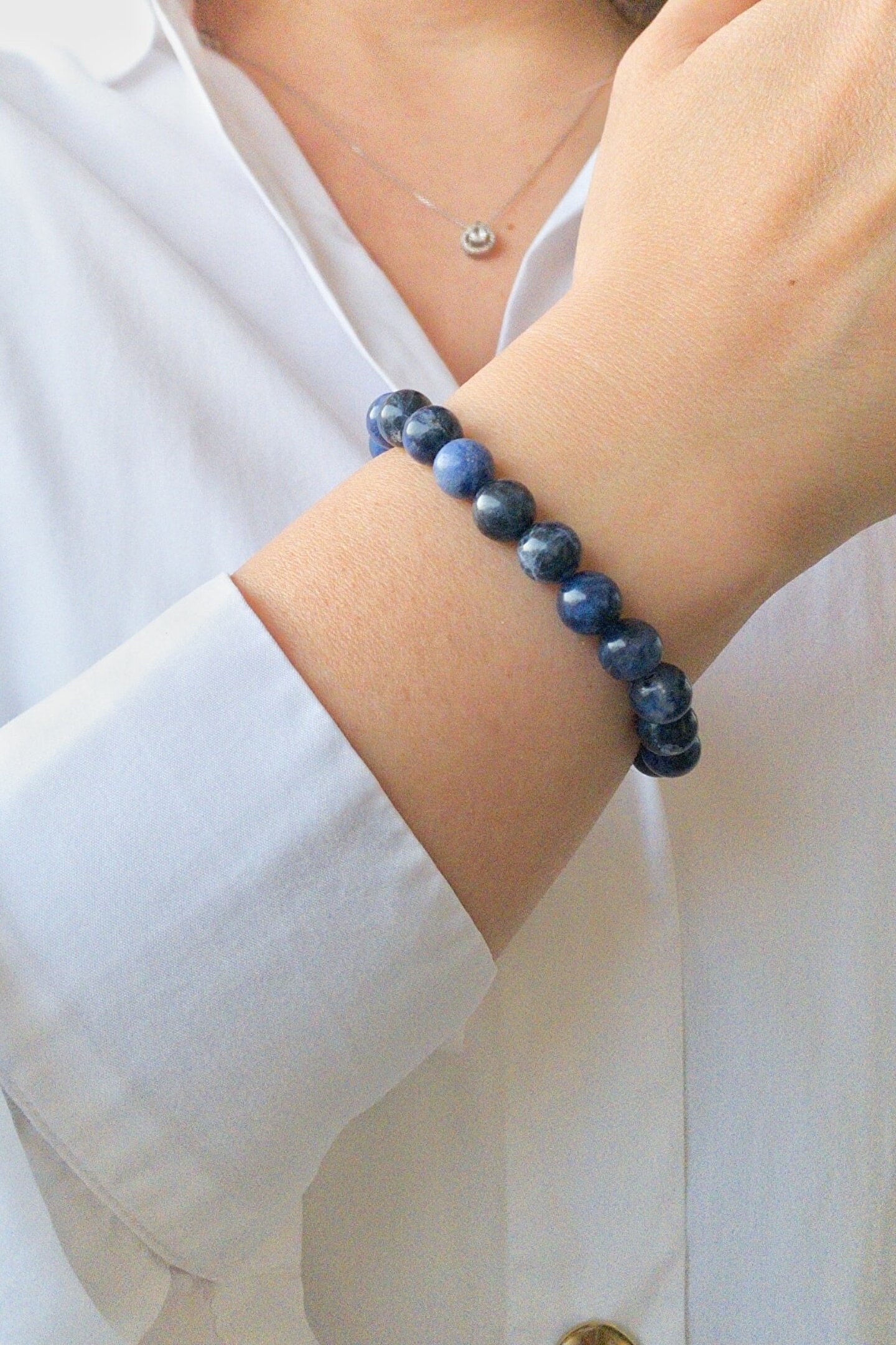 Doğal taş bileklik, hem şıklığı hem de doğallığı bir arada sunar; sodalit taşı ile tasarlanmıştır; Gençlerin enerjisine hitap eden bu bileklik, Yay burcu mantık taşı olarak bilinen 5; boğaz ve 6; alın çakrasını içerir; Doğal taş materyali sayesinde her bileklik benzersizdir ve her kullanımda farklı bir deneyim sunar;