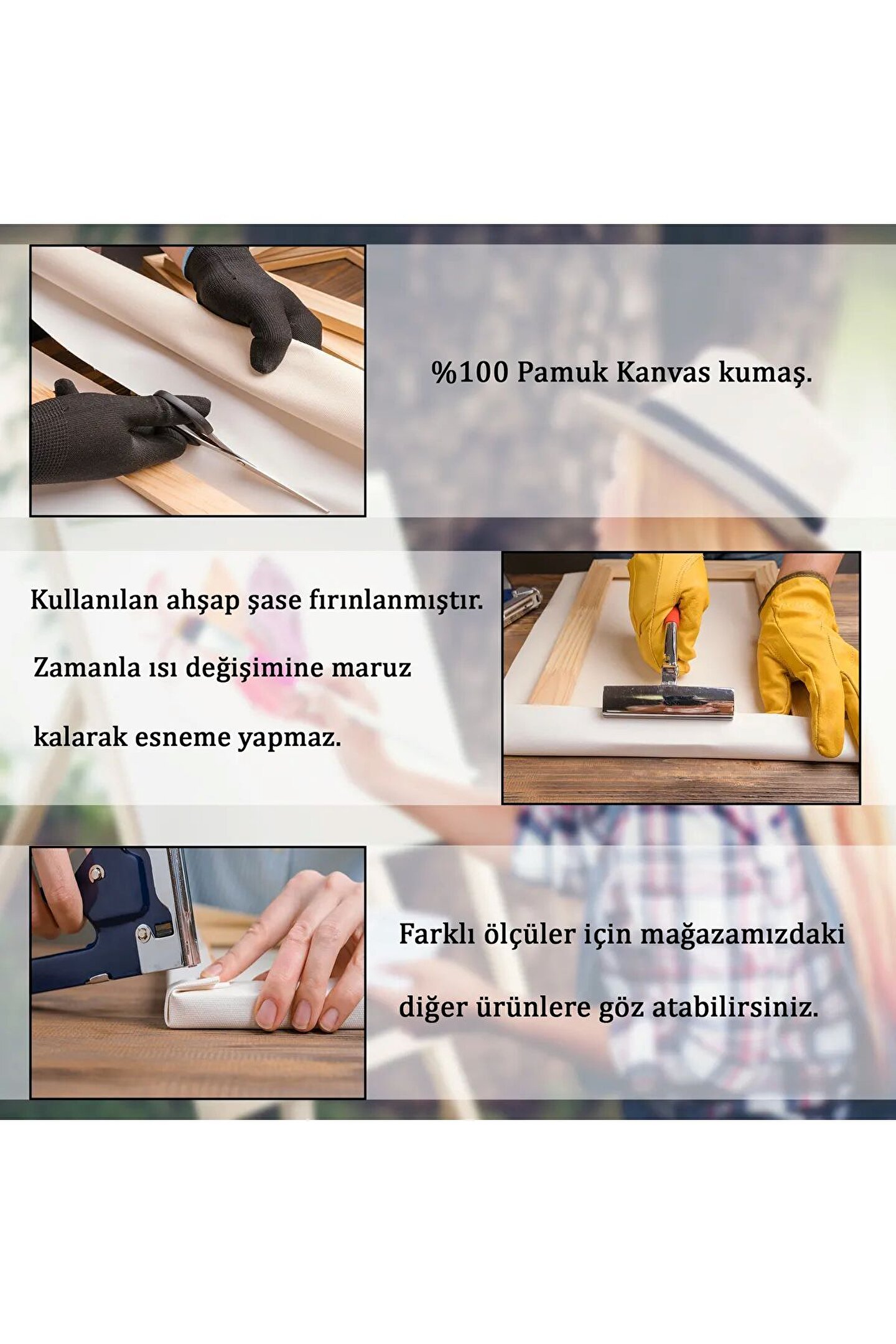 Yüksek Kaliteli %100 Pamuklu Büyük Ölçüler Double Şaseli ve Arkadan Desteklidir Yamulma Eğilme Yapmaz El İşçiliği İle yüksek Kalitede Gerginlik Sağlanmıştır.; %100 pamuklu orijinal sanatsal tuval bezidir.; Ürünlerimiz El işçiliğiyle özel olarak tek tek üretilir.; Kırtasiyelerde satılan başlangıç veya öğrenci tipi tuvaller gibi değildir.; Tüm boyamalar için kalitede uygundur.; Pvc asit içermez.; Büyük ebatlı olan ölçüler arkadan desteklidir eğilme yamulma esneme yapmaz.