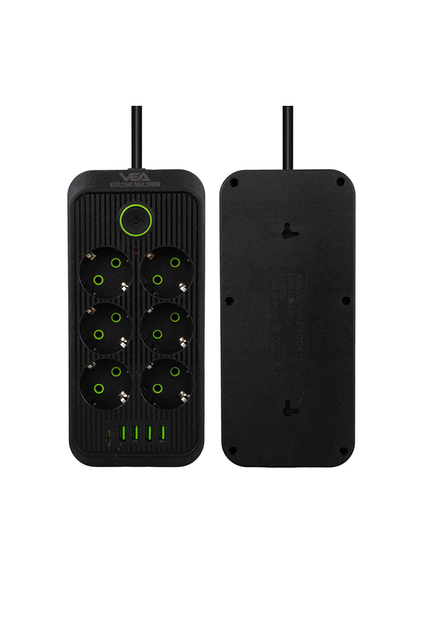 VEA VA-21563 6'lı Grup Priz Özellikleri Evinizde veya iş yerinizde birden fazla elektrikli cihazı güvenle bağlamak ve şarj etmek için ideal bir çözüm arıyorsanız, VEA VA-21563 6'Lı Akım Korumalı Priz tam size göre! 6 priz çıkışı ve 1 adet Type-C ve 4 adet USB portuyla donatılmış bu akıllı priz, güvenli ve pratik bir enerji dağıtımı sağlar. VEA VA-21563 6'Lı Akım Korumalı Priz, evinizde veya iş yerinizde elektrikli cihazları düzenlemek ve şarj etmek için ideal bir çözümdür. Hem priz hem de Type-C ve USB portları ile çok yönlü kullanım sunar, aynı zamanda 750 dereceye kadar yanmaya dayanıklı özel malzemesi ile güvenliği ön planda tutar. Ürün Detayları: 6 Priz Çıkışı: Birden fazla cihazı aynı anda bağlayabilirsiniz.; 4 USB Portu: Telefonlar, tabletler ve diğer USB cihazlarınızı şarj etmek için ekstra portlar.; Type-C Portu: Telefonlar, tabletler ve diğer Type-C cihazlarınızı şarj etmek için ekstra portlar.; 750 Derece Yanmaya Dayanıklı: Özel malzemesi sayesinde yüksek sıcaklıklara karşı dayanıklıdır.; Akım Koruma: Elektrik akımı dalgalanmalarına karşı cihazları korur.; 16A Kapasite, 3000W Güç: Yüksek güç ihtiyacını karşılar, aynı anda birçok cihazı güvenle çalıştırabilirsiniz.; 1.5 Metre Kablo Uzunluğu: Esnek kullanım için ideal uzunluk.; Pratik Anahtarlar: Her priz için on-off anahtarlarıyla cihazları kolayca kontrol edin.; Neden Tercih Etmelisiniz? Güvenlik: 750 dereceye kadar yanmaya dayanıklı malzeme ve akım korumasıyla ev ve iş yerinizde güvenli bir enerji dağıtımı sağlar.; Pratiklik: 6 priz, 1 Type-C ve 4 USB portuyla çoklu cihaz bağlantısı yapabilir, enerji dağıtımınızı optimize edebilirsiniz.; Dayanıklılık: Yüksek kaliteli malzeme ve sağlam yapı, uzun ömürlü kullanım sağlar.; Esneklik: 1.5 metrelik kablo uzunluğuyla prizi istediğiniz yere kolayca yerleştirebilirsiniz.; VEA VA-21563 6'Lı Akım Korumalı Priz, güvenli, pratik ve dayanıklı bir enerji dağıtımı için ideal bir seçenektir. Evde veya iş yerinde birden fazla cihazı bağlamak ve şarj etmek için mükemmel bir çözümdür. Yüksek güç kapasitesi, akım koruması ve Type-C, USB portlarıyla modern yaşamın gereksinimlerini karşılar, aynı zamanda uzun ömürlü kullanım ve güvenlik sağlar.