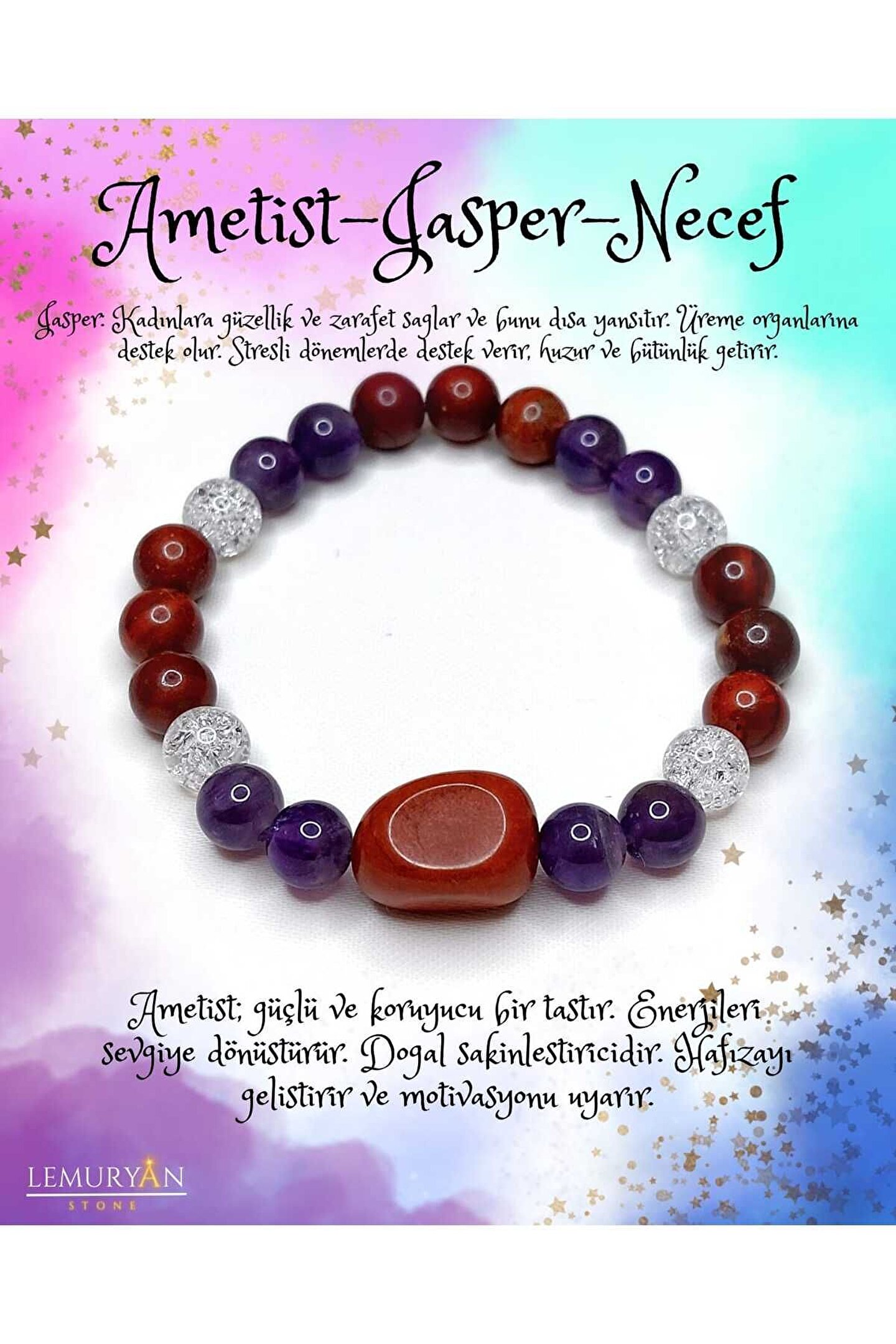 Doğal taş kullanımı sayesinde her bileklik benzersiz ve otantik bir görünüm sunar; Ametist ve jasper gibi değerli taşların birleşimi, hem şıklığı hem de enerjiyi bileğinizde taşımanızı sağlar; Doğal taşların renk ve desen farklılıkları, her bir bilekliğin eşsiz ve kişisel bir dokunuş kazanmasını garanti eder; Doğal taşların sağladığı zarif ve doğal görünüm, günlük kullanım için idealdir ve her türlü kıyafetle uyum sağlar;
