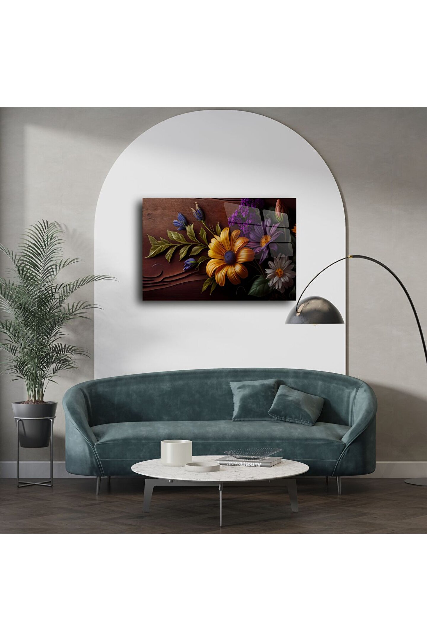 Doğallığı ve zarafeti bir araya getiren bu cam tablo, ahşap zemin üzerinde öne çıkan sarı, mor ve beyaz çiçekleriyle rustik bir şıklık sunar. Modern iç mekanlara sıcaklık ve doğa hissi katar.