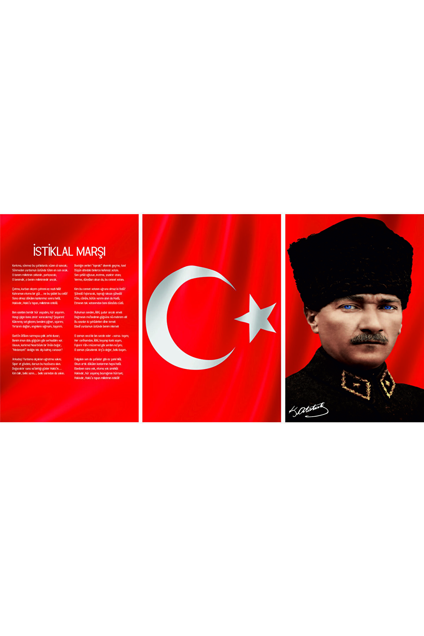 3 adet Cam Tablo fiyatıdır. Uygun varyantı seçerek sipariş verebilirsiniz.; 1. tabloda istiklal marşı yazılıdır.; 2. tabloda ay yıldız Türkiye Bayrağı vardır.; 3. tabloda Gazi Mustafa Kemal Atatürk portresi vardır.; Leylaser cam tablolar 4 mm kalınlığında temperii camlardan üretilmiştir.; Temperli camlar normal camlara göre kırılmaya 10 kat daha dayanıklıdır.; Kenarları rodajlanarak kesilciliği giderilmiştir.; Kargolama yapılırken özel kolisinde, koruma aparatları ve montajda kullanılacak (vida, dübel vs) malzemeler ile gönderilmektedir.; Yanında gönderilen askı aparatlarından duvara monte edilecek olan parçayı vida ve dübel ile duvara monte ettikten sonra arkasında yapıştırılmış olan askı aparatını da duvardaki parçaya geçirerek sağlam bir şekilde kullanabilirsiniz.; Tablonuzun ön kısmını standart cam temizleme teknikleri ile korkmadan temizleyebilirsiniz.; Cam yüzeyine uv baskı tekniğiyle yüksek çözünürlüklü makinalarımız tarafından baskı yapılır. Yüksek kaliteli bir görüntü derinliği sağlar. Görseller camın arka yüzeyine basılır ve beyaz renk ile arka yüzey kapatılır.; Tasarımlar ön yüzeyden camın parlaklığı ile görülür.; Cam tablolar zamanla solma yapmaz ve renkler her daim canlı kalır.; Bu ilan BizimHesap.com ile yayınlanmıştır.