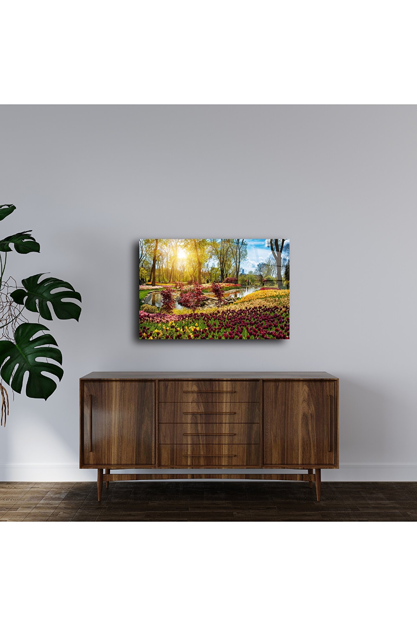 Kiraz ağacının altından geçen bu pastoral yolda gün ışığıyla buluşan cam tablo, huzur dolu bir anı ölümsüzleştiriyor. Gerçek cam üzerine yüksek çözünürlüklü baskısıyla evinize lüks, sakin ve şık bir hava katar.