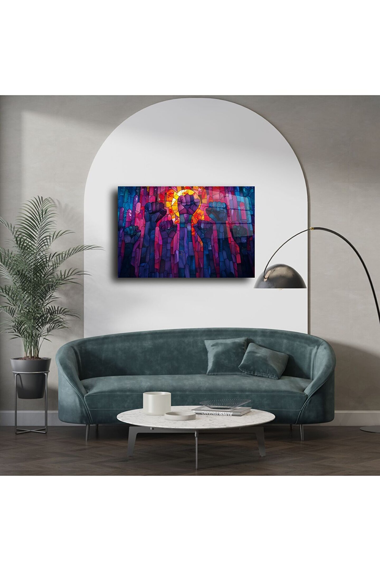 Renklerin ve ifadenin bir araya geldiği bu Cam Duvar Sanatı Direniş Paneli, yalnızca dekor değil; bir duruşun, umudun ve birliğin sanatla buluşmasıdır. Güçlü yumruk figürlerinin yer aldığı bu özel tasarım, yüksek kaliteli temperli camüzerine işlenmiş ve ışığı yansıtarak mekânınıza canlılık katmak üzere üretilmiştir.