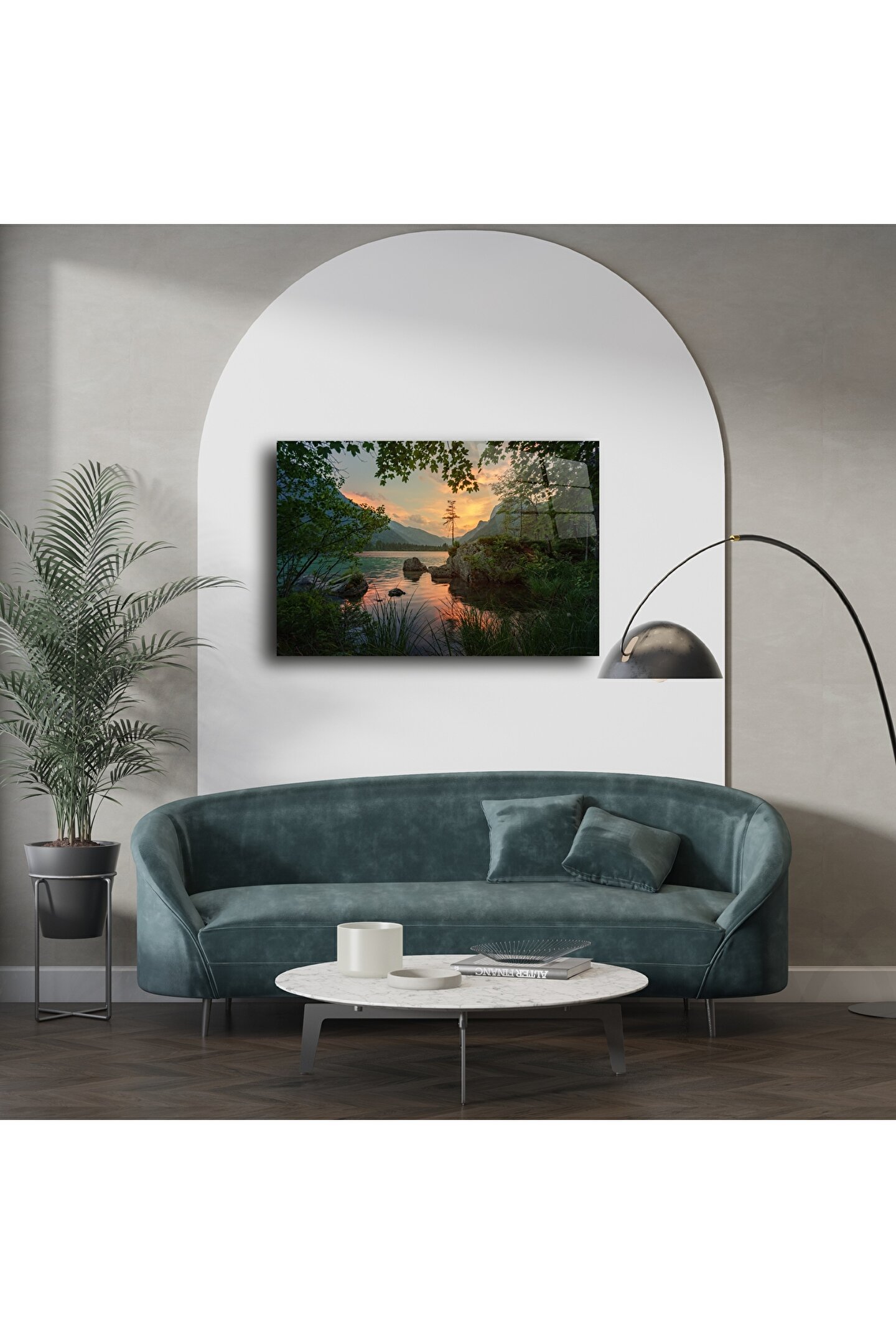 Cam Duvar Sanatı Gün Batımı Göl Manzarası, doğanın dinginliğini ve ışığın büyüsünü bir araya getirerek yaşam alanlarınıza zarif bir atmosfer katıyor. Göl yüzeyine yansıyan altın tonlarındaki gün batımı, yemyeşil orman dokusu ve dağ silüetleriyle birleşerek zamansız bir huzur sunuyor.