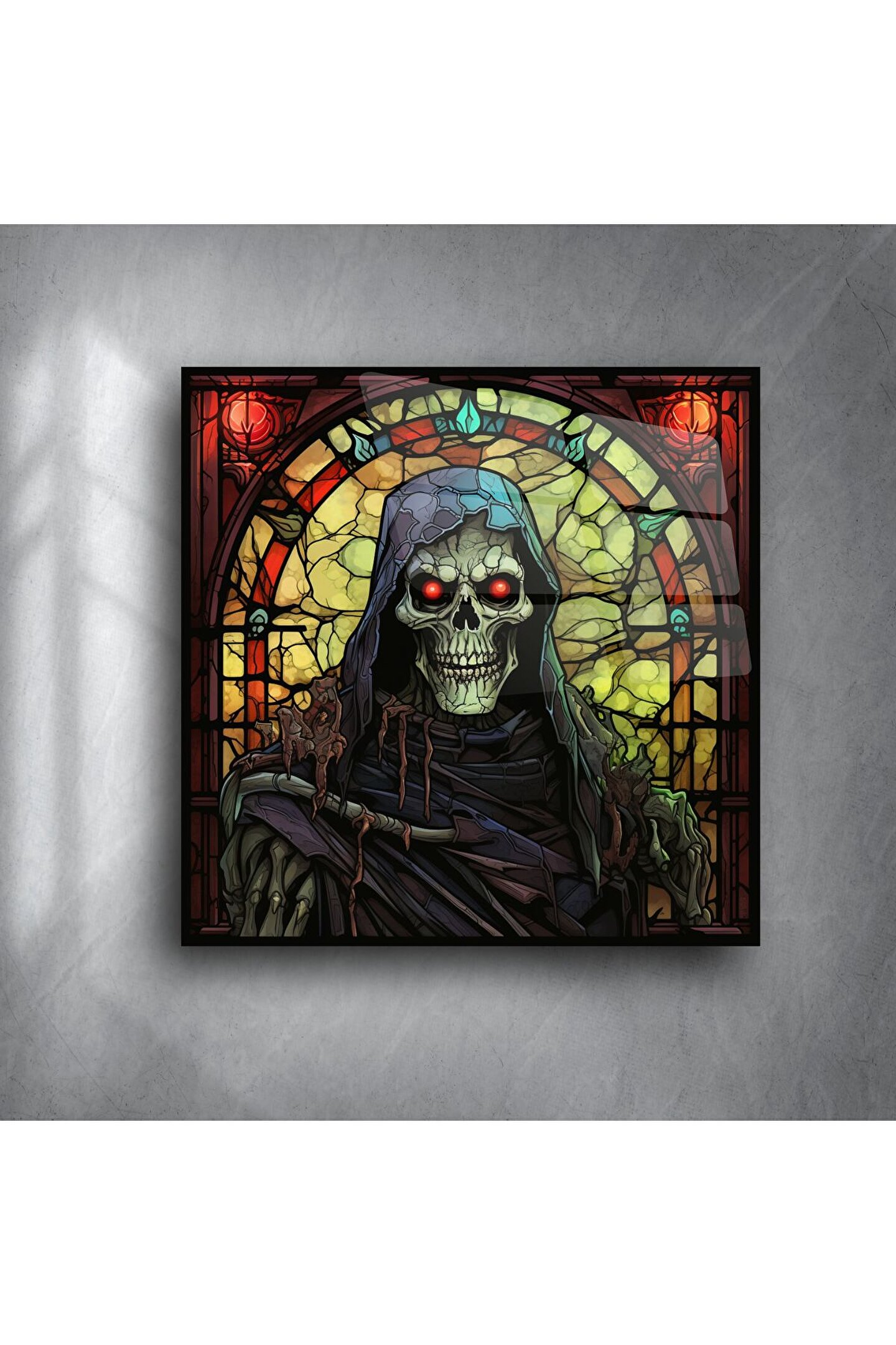 Kızıl gözler, vitray stili arka plan ve dramatik kontrastlar bu parçayı karanlık temalı ev dekorasyonlarının yıldızı yapar. Salon, koleksiyon odası ya da temalı bir ofis ortamı için ideal bir atmosfer yaratır.