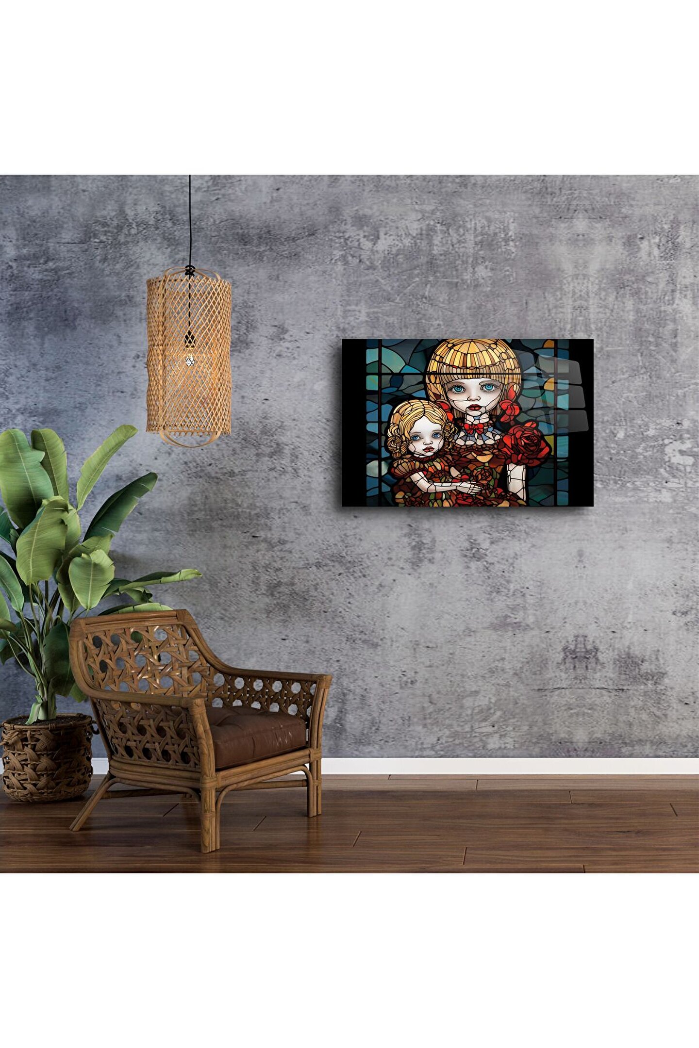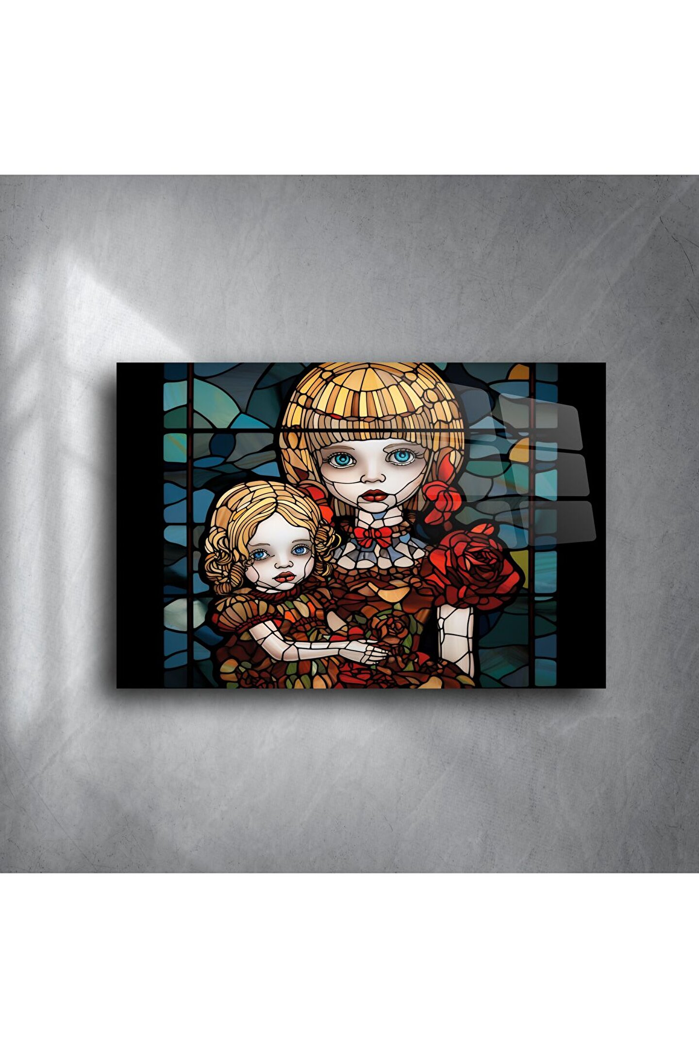 Bu göz alıcı Cam Duvar Sanatı Kız Kardeşler Paneli, sadece görsel değil, duygusal bir hikâye de anlatır. Gotik tonlarla işlenmiş bu detaylı portre, iki kız kardeşi zarif bir çiçek dokusu ve dramatik ifadelerle yansıtarak güçlü bir bağ ve koruyuculuğu simgeliyor.