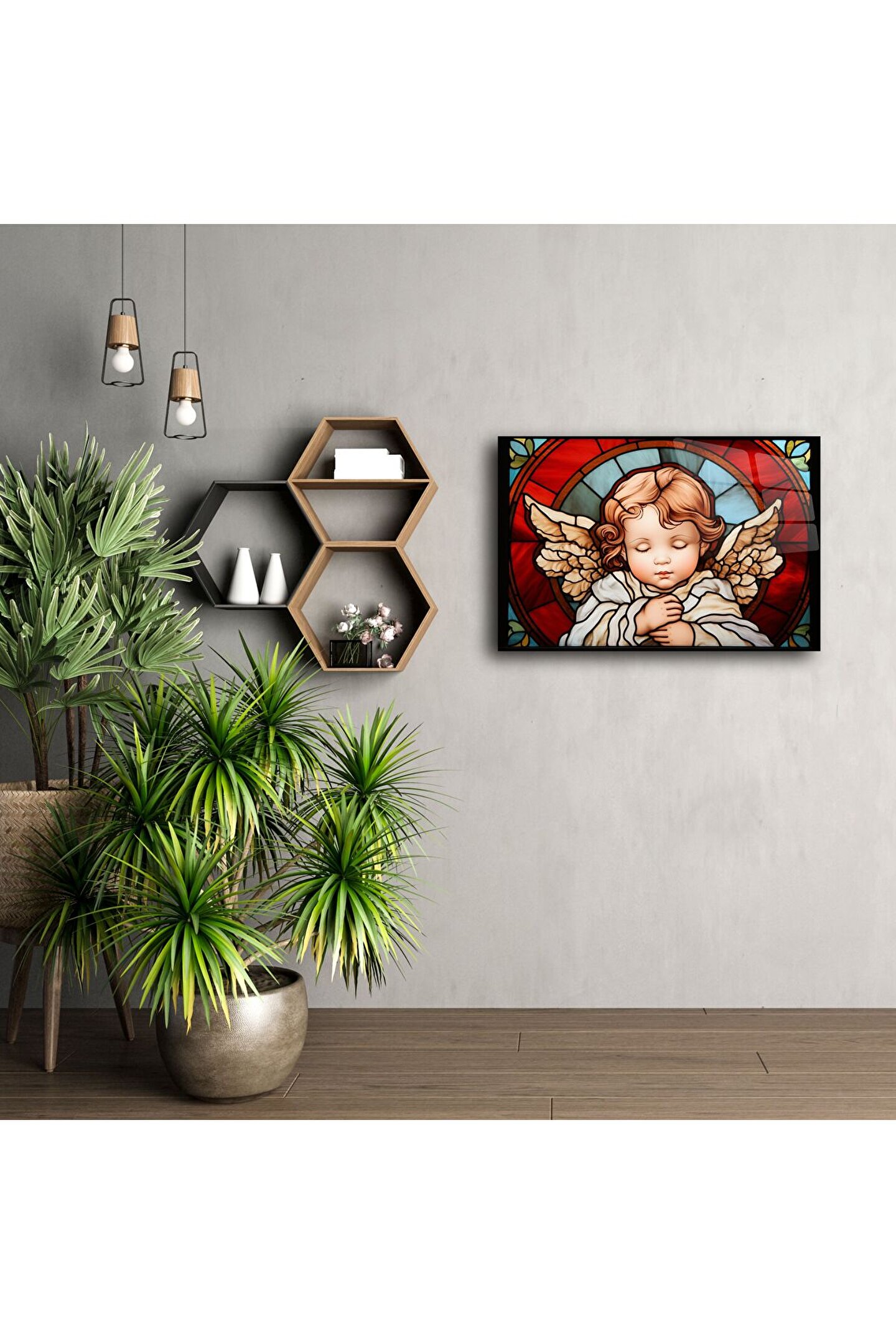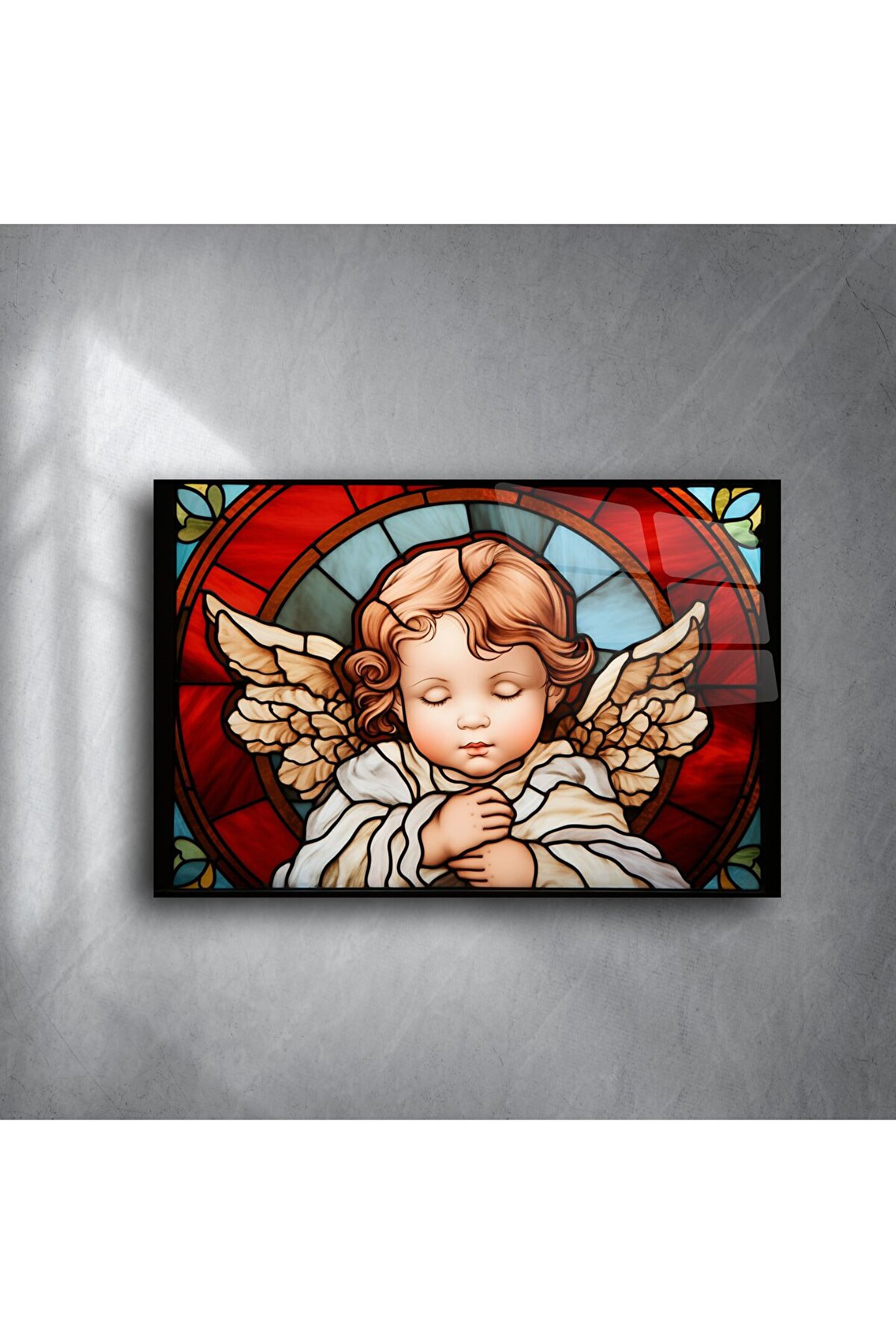 Canlı kırmızı ve altın tonlarının birleştiği bu vitray tarzı tasarım, derin bir dinginlik ve estetik sunar. Meditasyon alanları, ibadet köşeleri, çocuk odaları ya da sevdiklerinize manevi bir hediye olarak idealdir.
